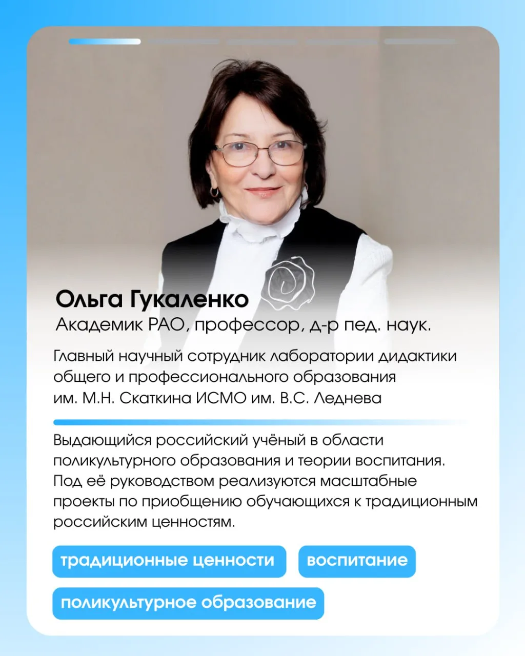 📌Под её руководством реализуются масштабные проекты по воспитанию на основе традиционных российских ценностей в поликультурных образовательных пространствах регионов России.