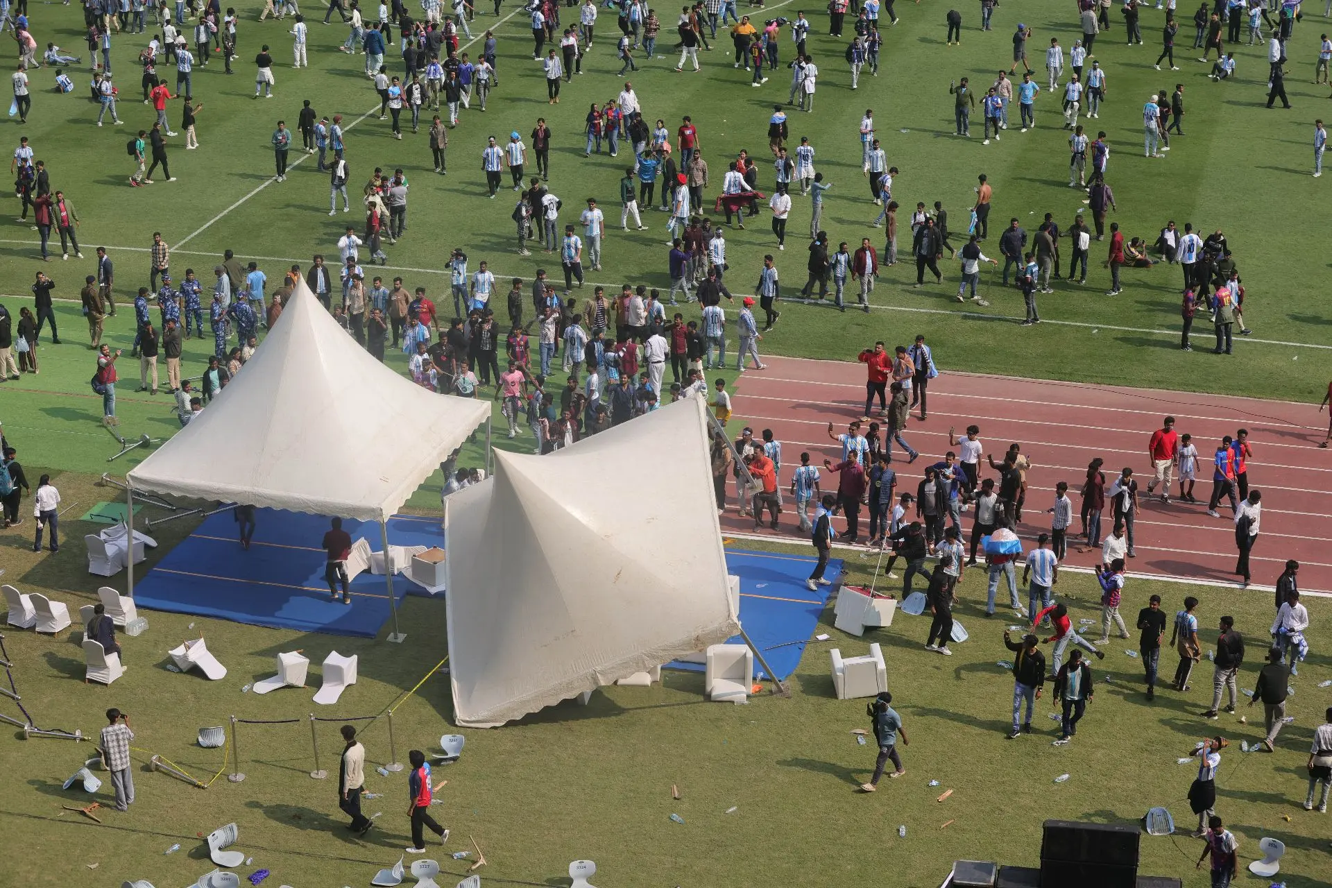 Фото из Калькутты, где фанаты, собравшиеся на стадионе на встречу с аргентинцем Лионелем Месси, остались недовольны организацией мероприятия. Игрок пробыл на стадионе всего около 15 минут в окружении официальных лиц. Разгневанные болельщики прорвались на поле, начали выламывать кресла и крушить рекламные конструкции.