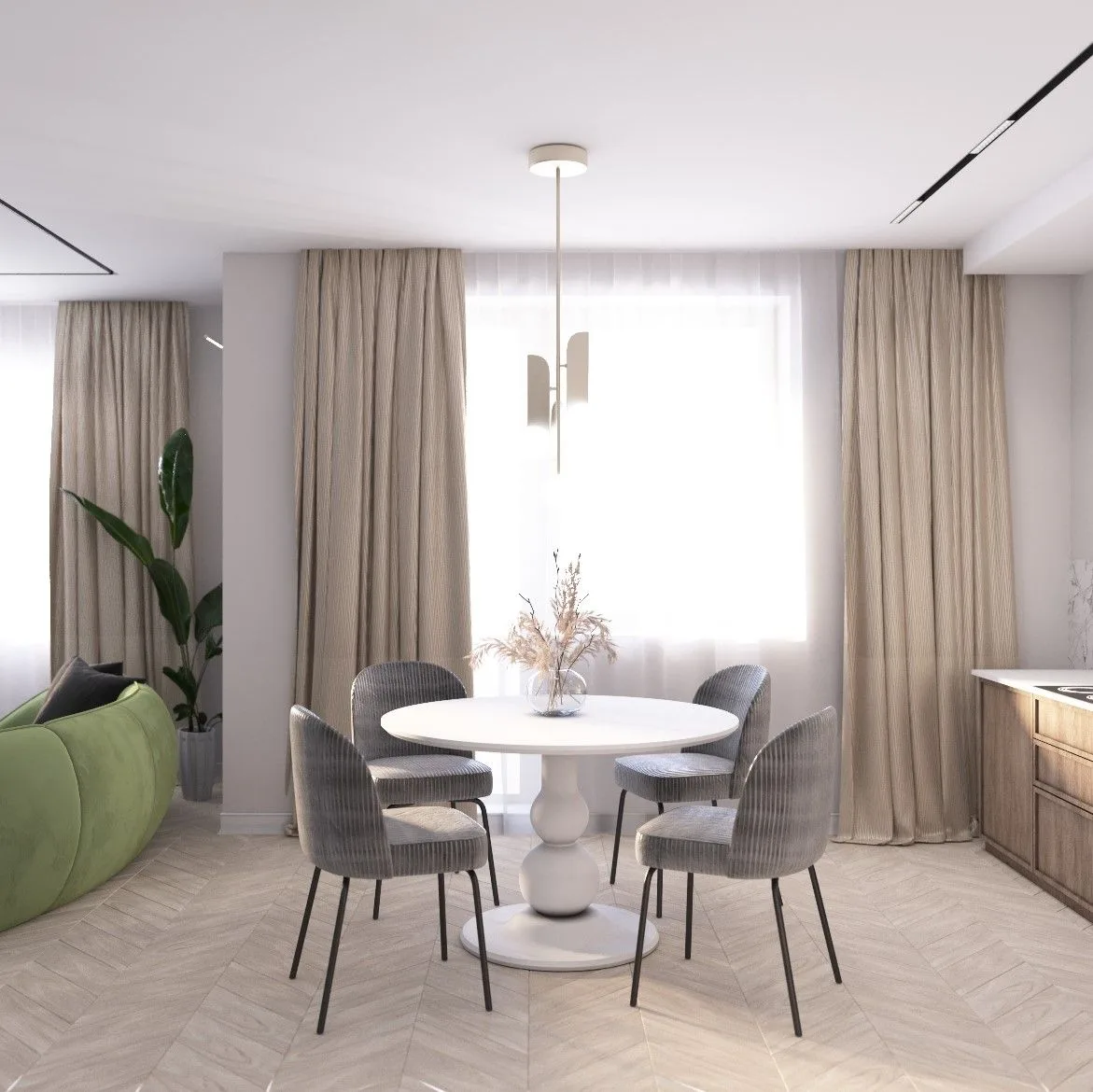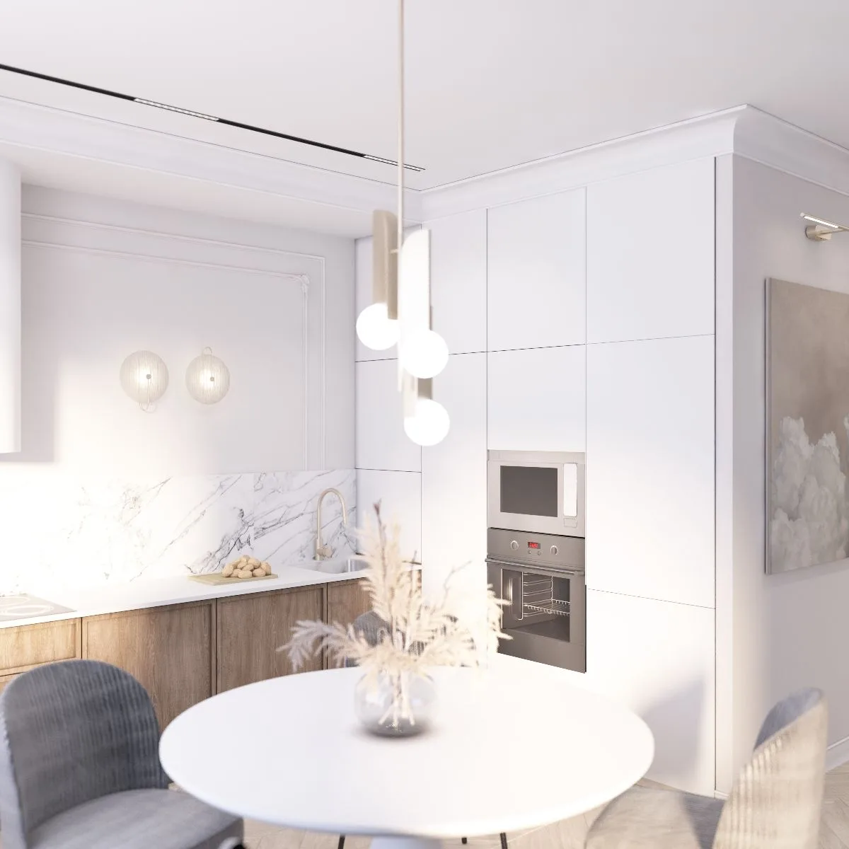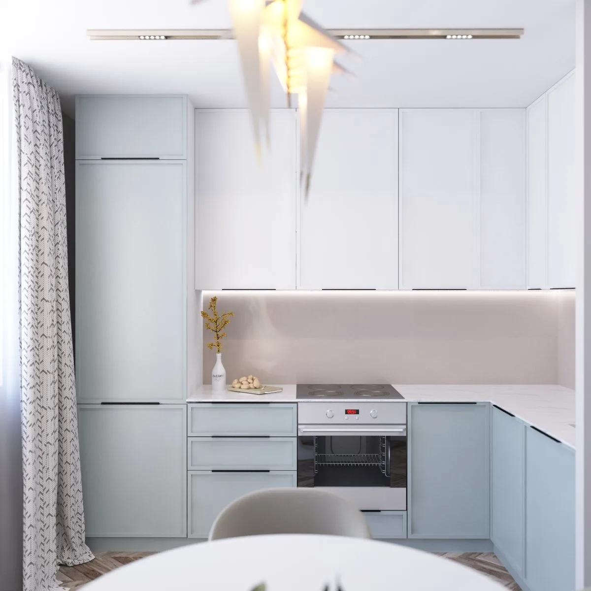Площадь помещения не большая, поэтому стараемся разместить в ней мебели по минимуму. Так же "прячем кухню", отказываясь от верхних ящиков. Так помещение выглядит более просторным