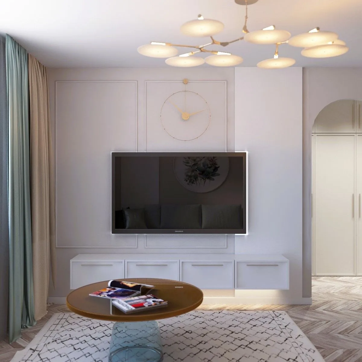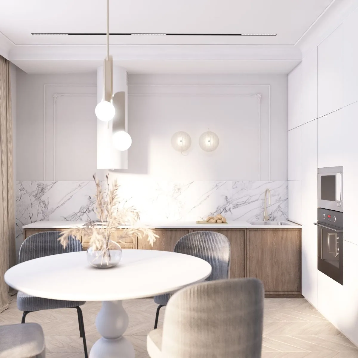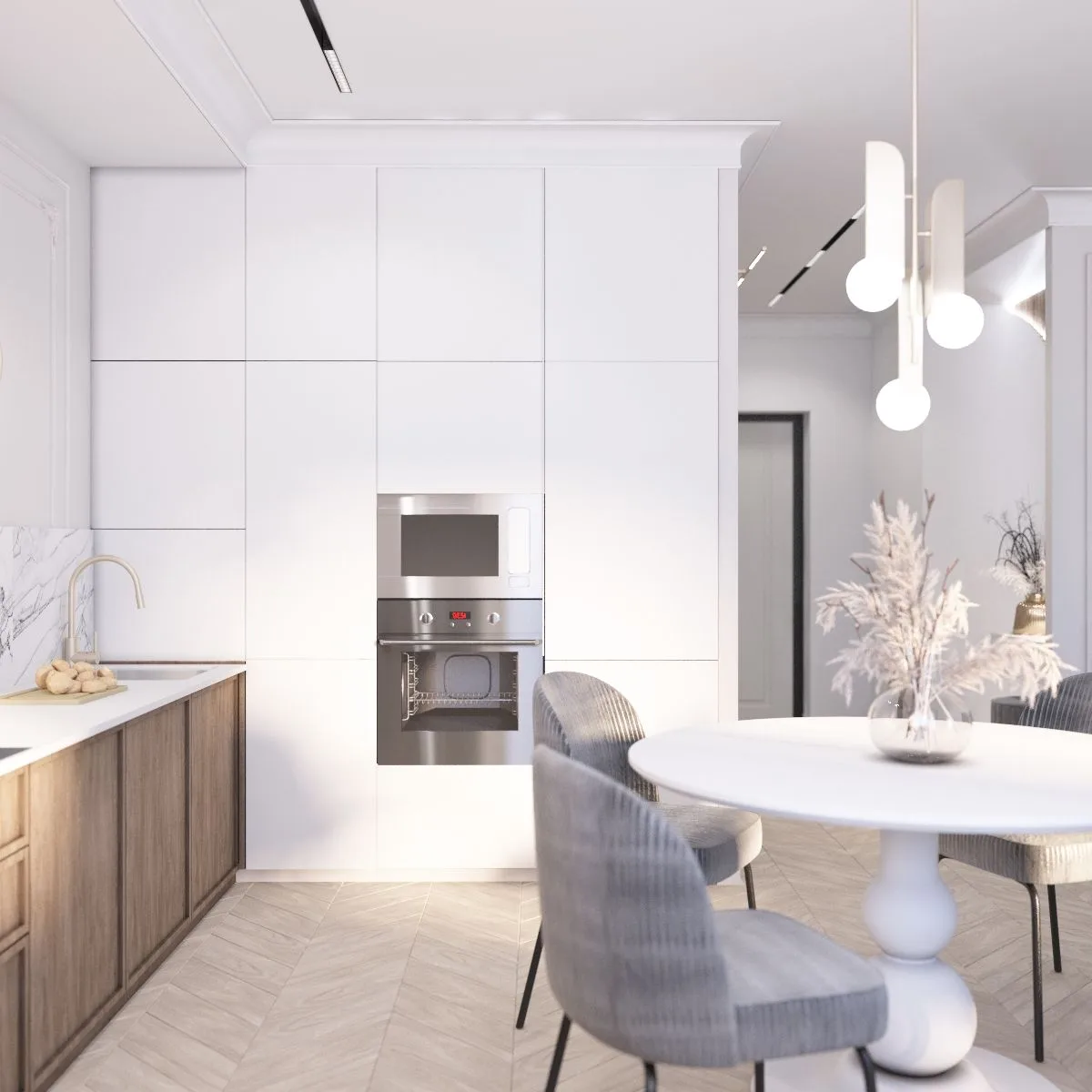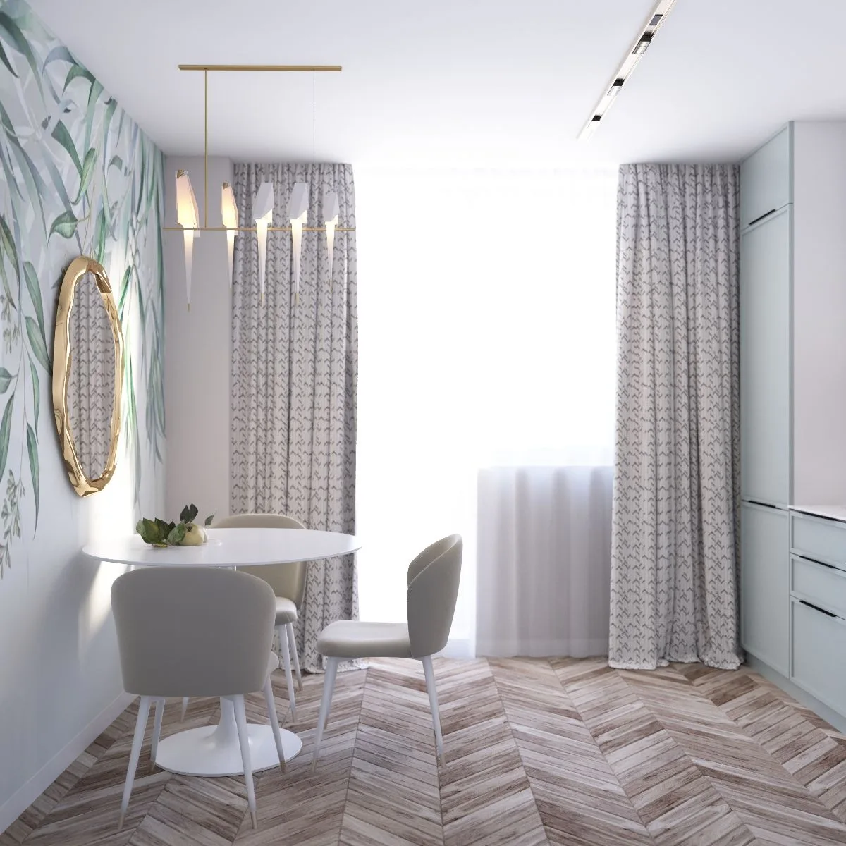 Площадь помещения не большая, поэтому стараемся разместить в ней мебели по минимуму. Так же "прячем кухню", отказываясь от верхних ящиков. Так помещение выглядит более просторным