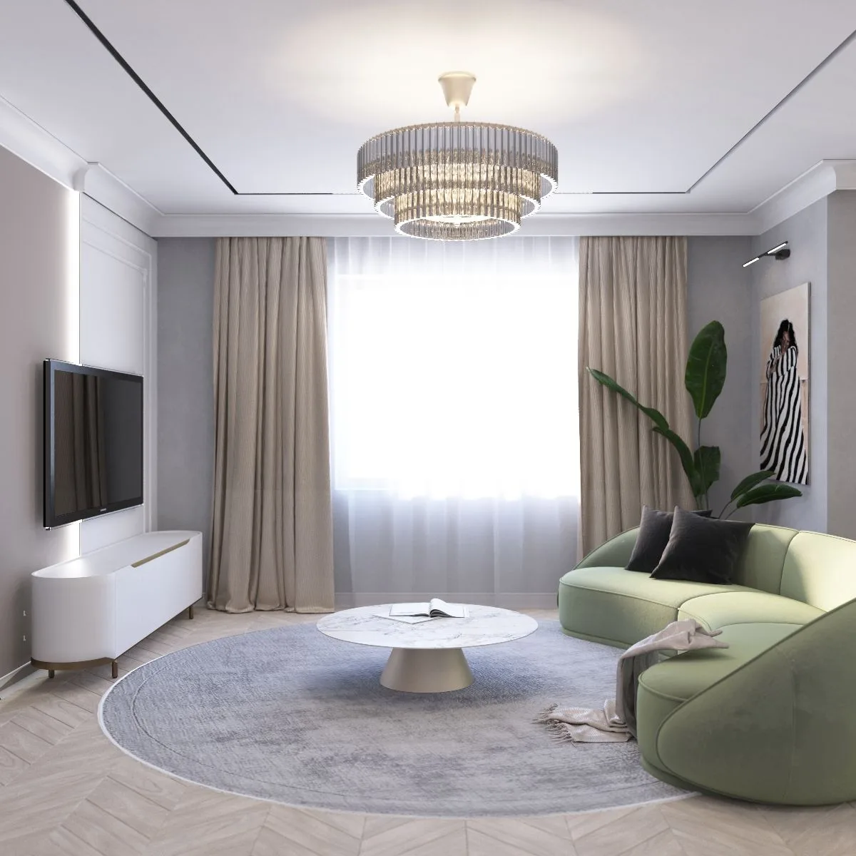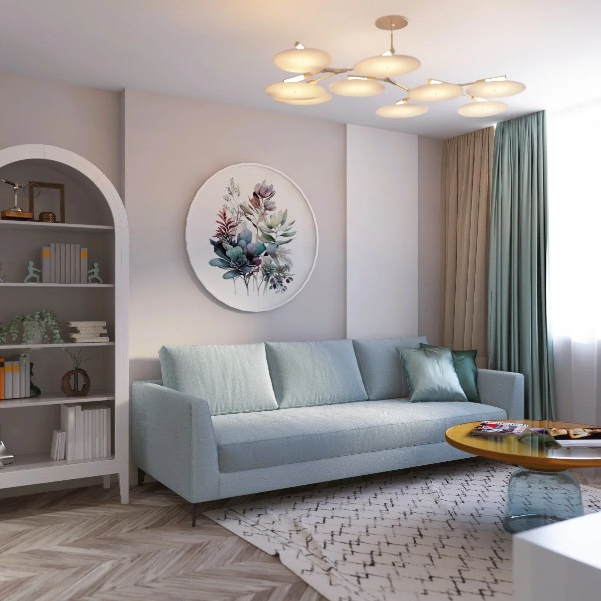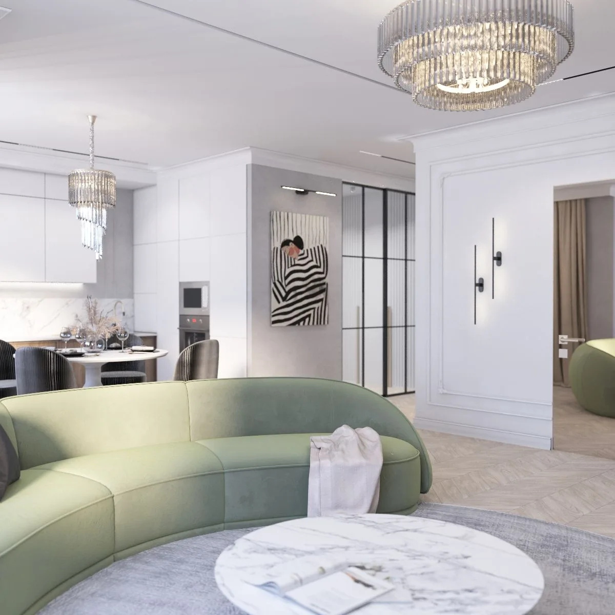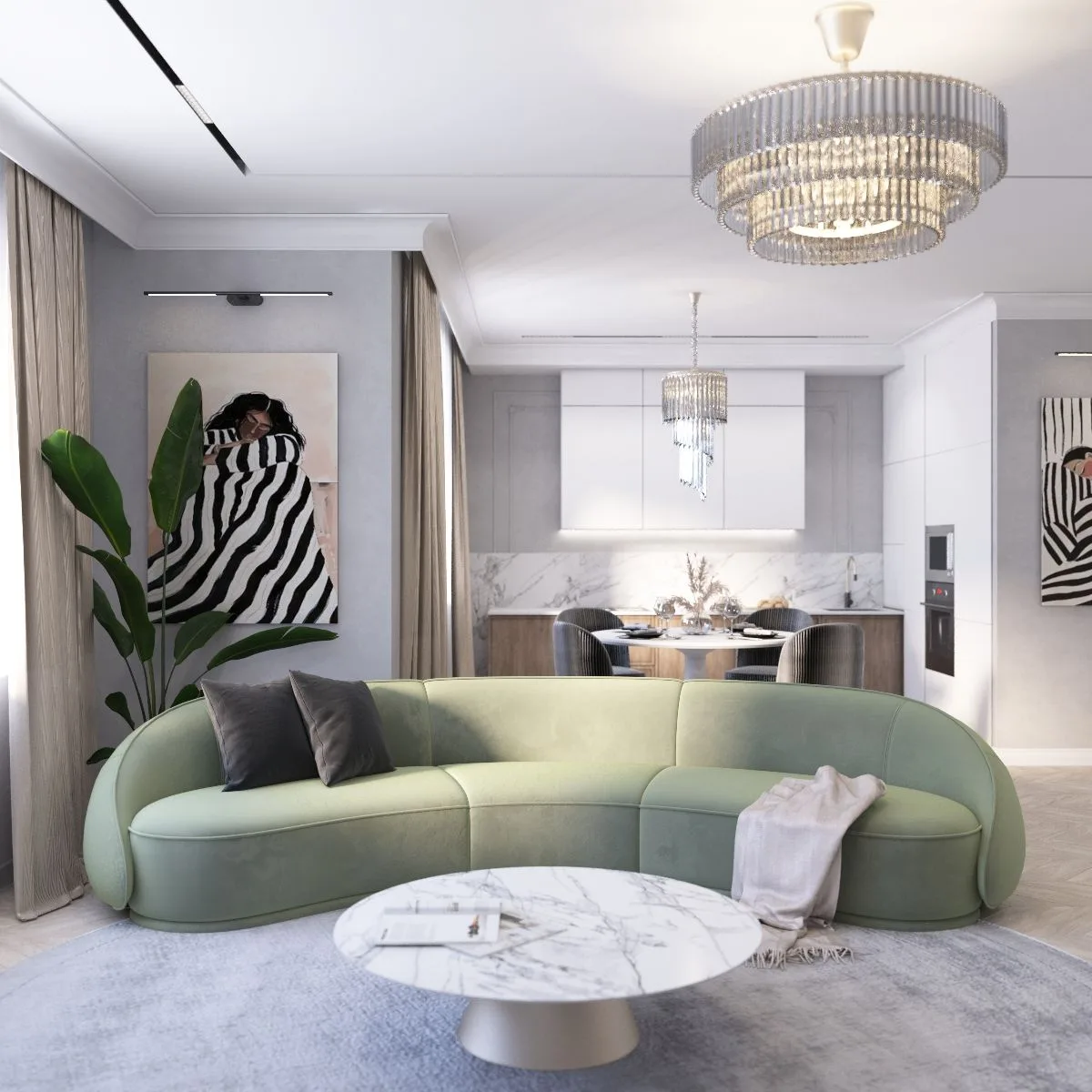 Заказчица попросила посмотреть, как все-таки будет выглядеть зеленый диван в интерьере. Ей эта мысль очень нравится