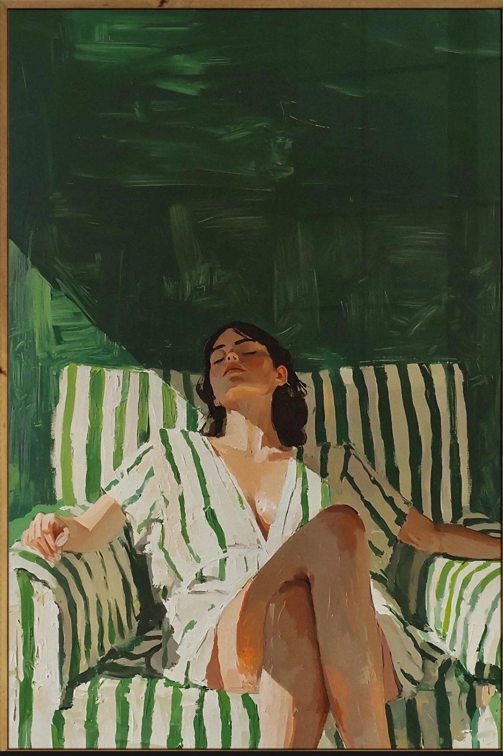 В первом варианте с зеленым диваном картины играли роль фона и лишь акцента, поэтому с ярким зеленым пятном не спорили