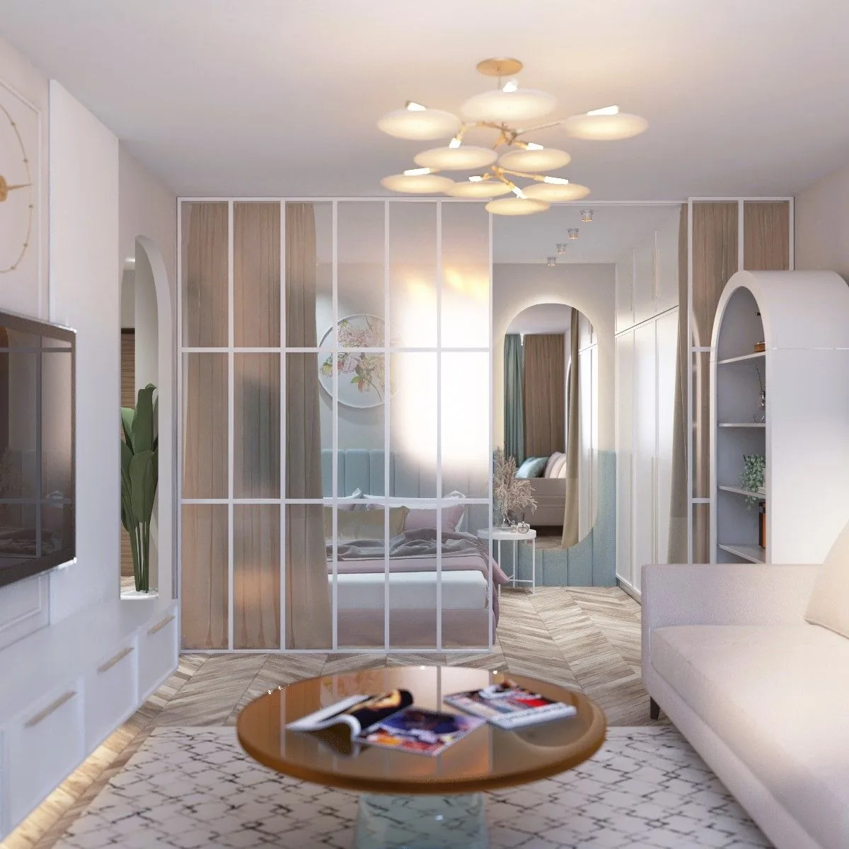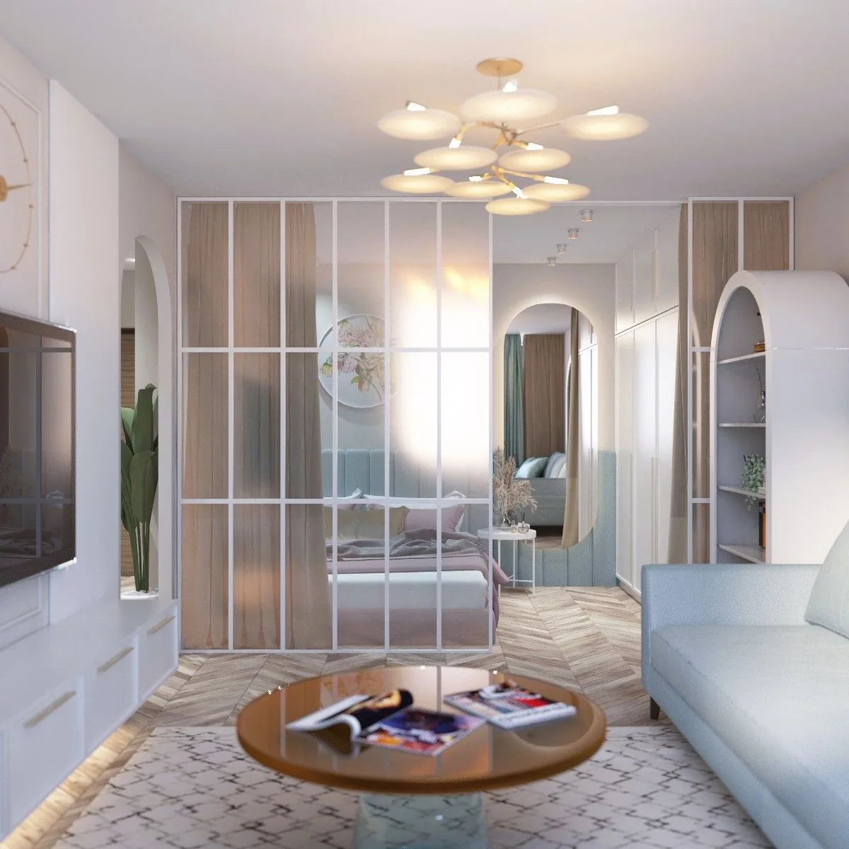 Перегородка легкая со стеклом и пропускает свет, но при желании можно создать приватность в зоне спальни и закрыть портьеры