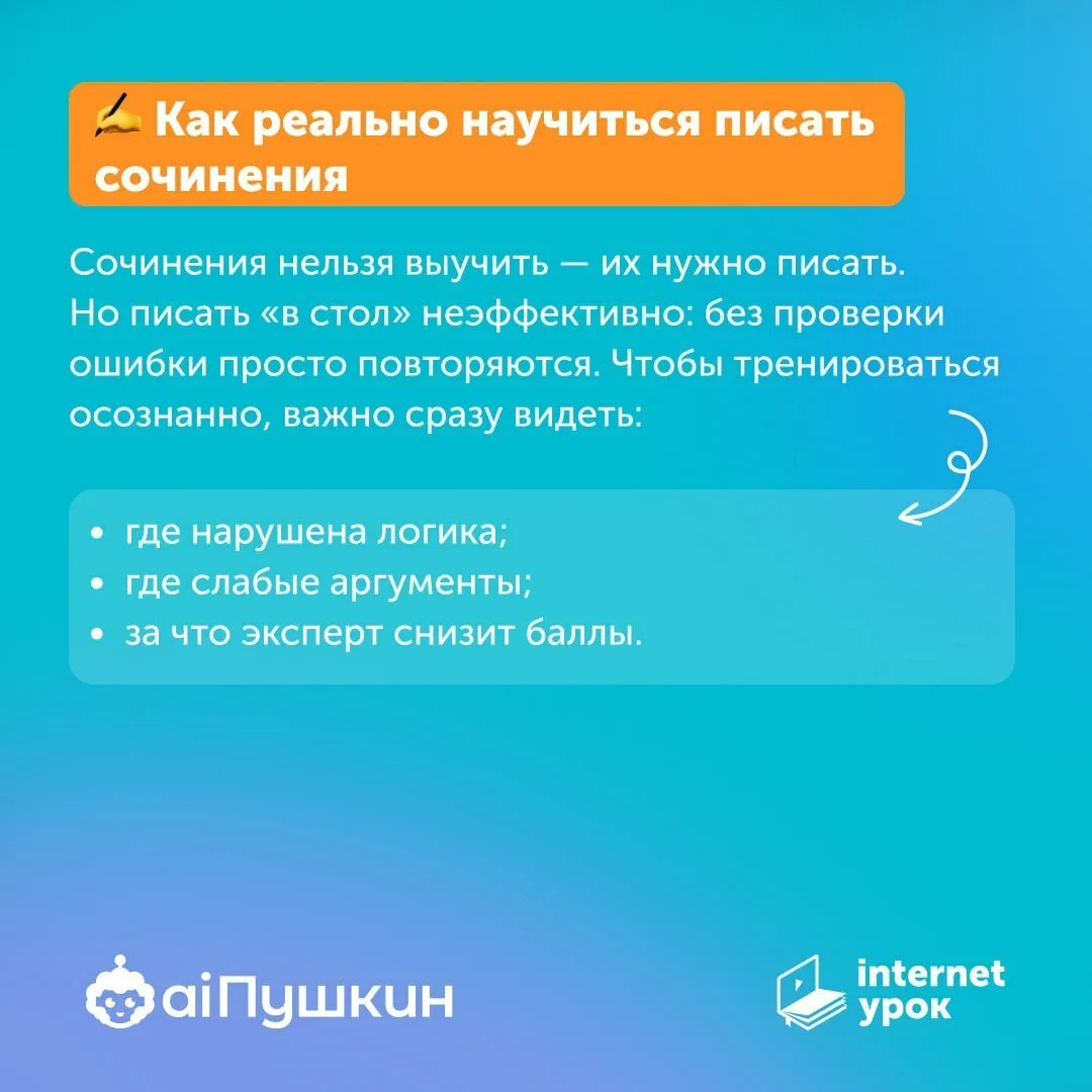 Поэтому мы сделали бот «aiПушкин» — он каждый день присылает короткие советы, примеры формулировок и напоминания о требованиях к сочинению. Чтобы важные мелочи не терялись и не забывались ✨
