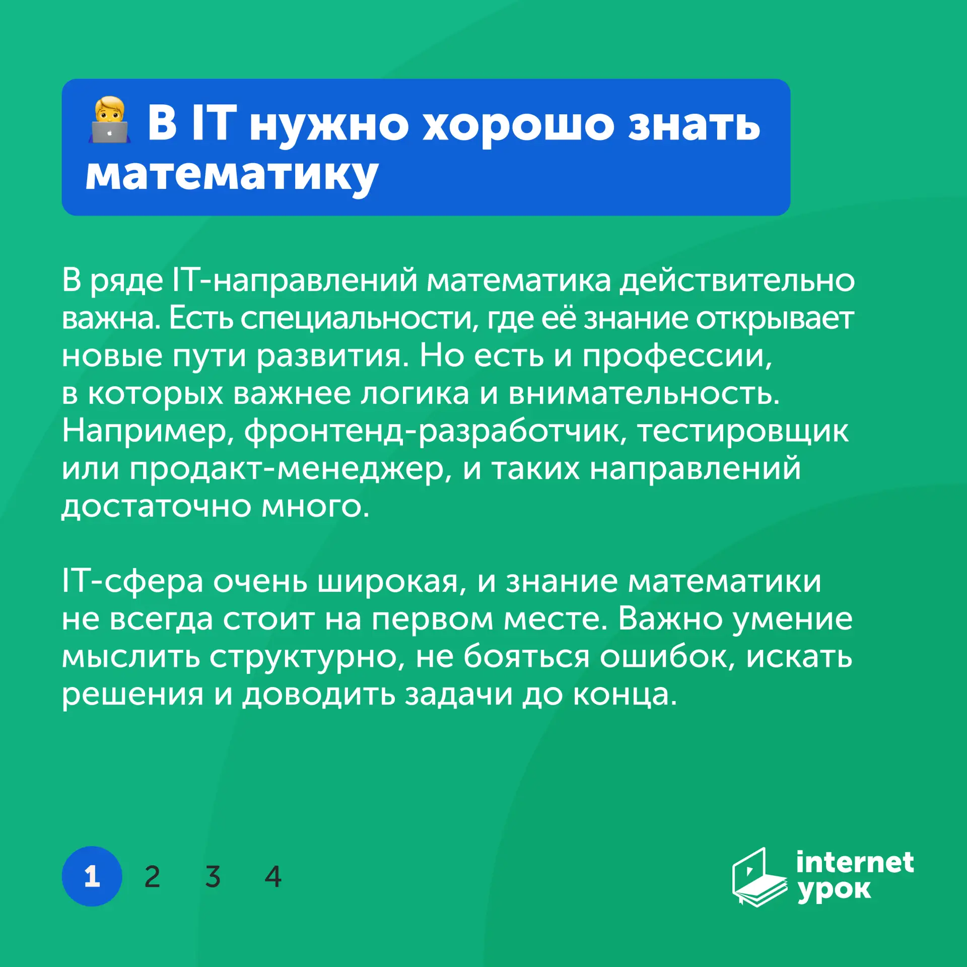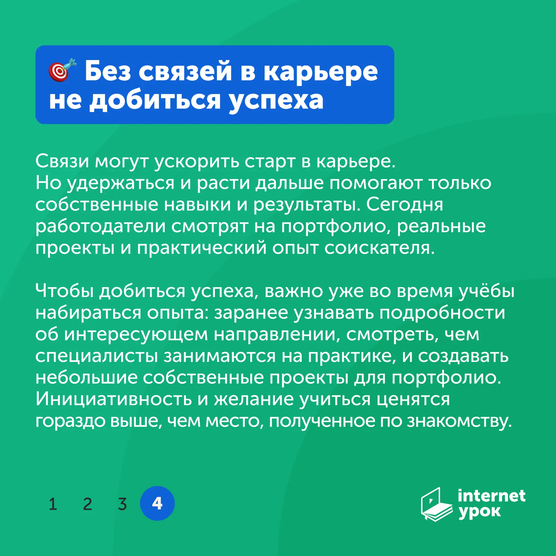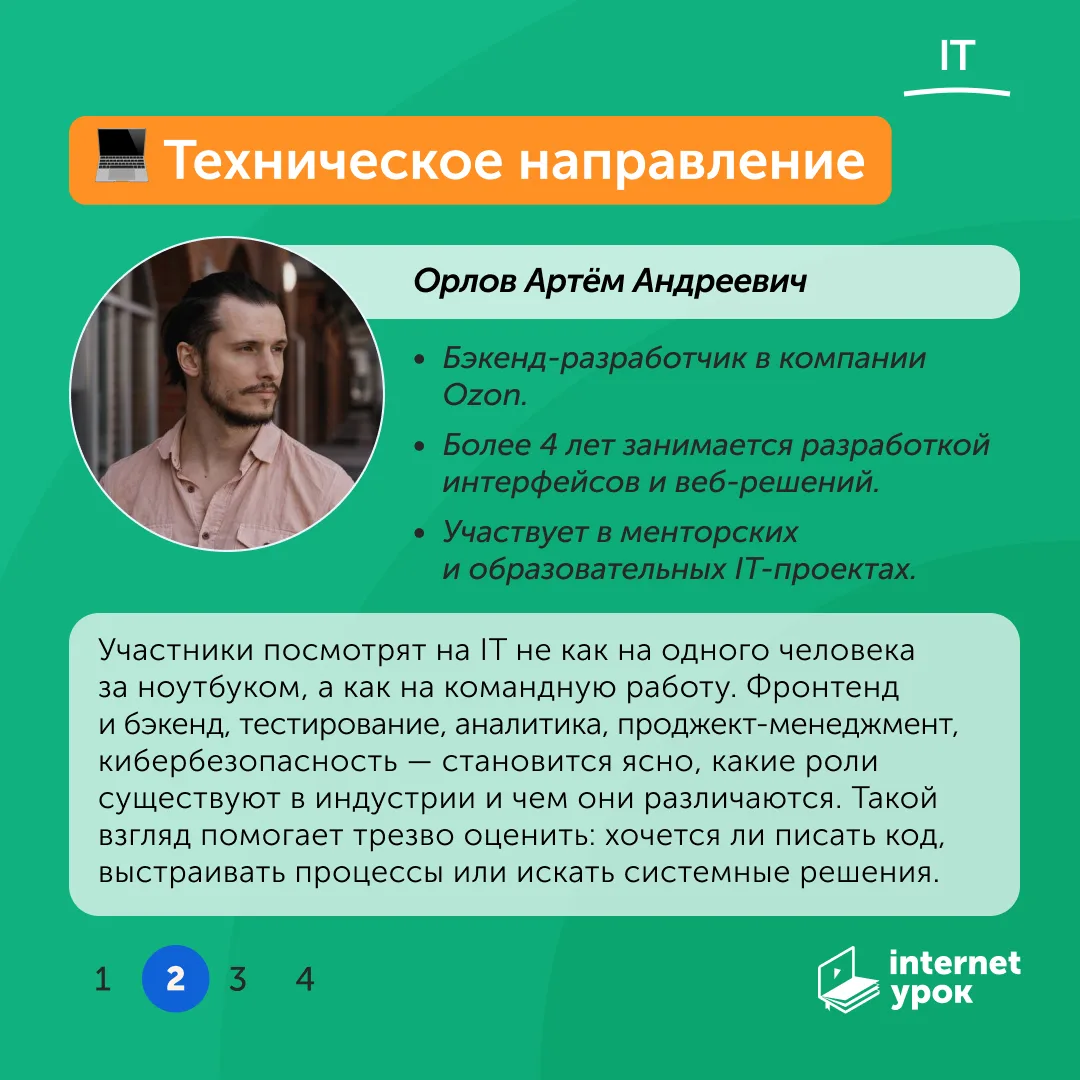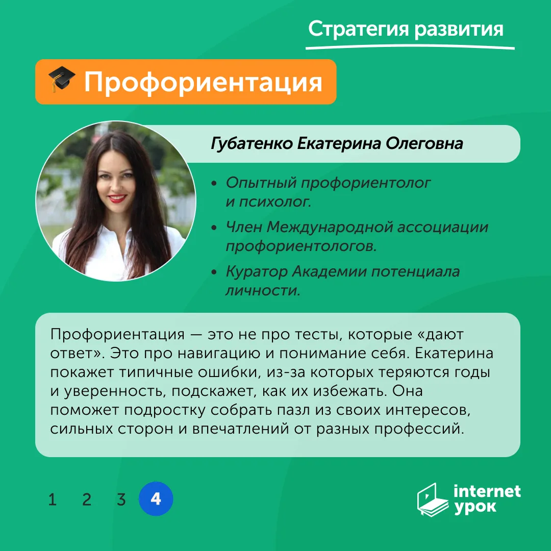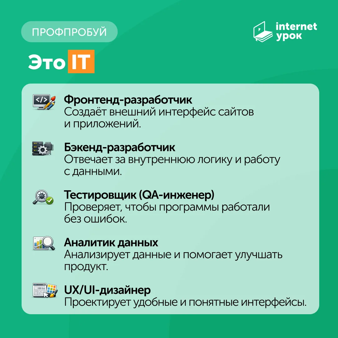 Там вы найдёте полезные материалы для тех, кто ищет честные ответы от практиков, а не сухую теорию. Вас ждёт: разбор профессий, интервью с сотрудниками ИнтернетУрока, профориентологами и карьерными консультантами, советы для старшеклассников и их родителей.