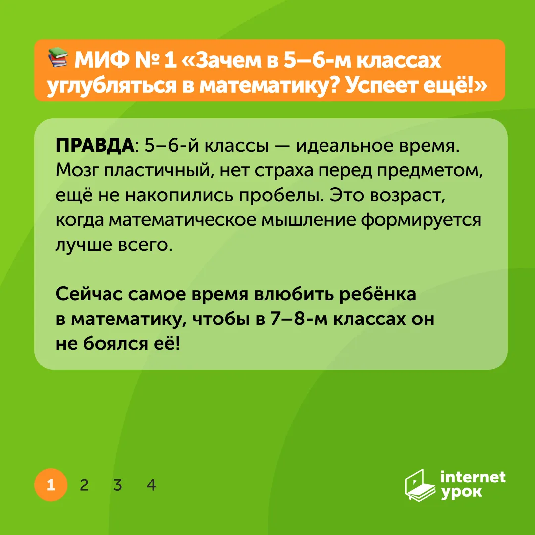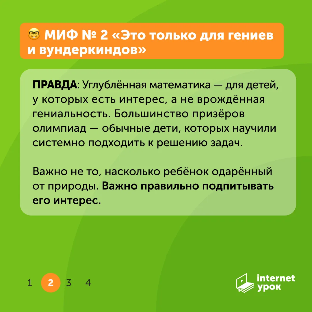 Этот курс — не просто дополнительные уроки математики. Это возможность развить логическое мышление на том уровне, который открывает двери в будущее. В карточках мы разобрали 5 главных мифов об углублённой математике: почему это не только для математически одарённых детей и почему идеально начинать именно в 5–6-м классах. Листайте!
