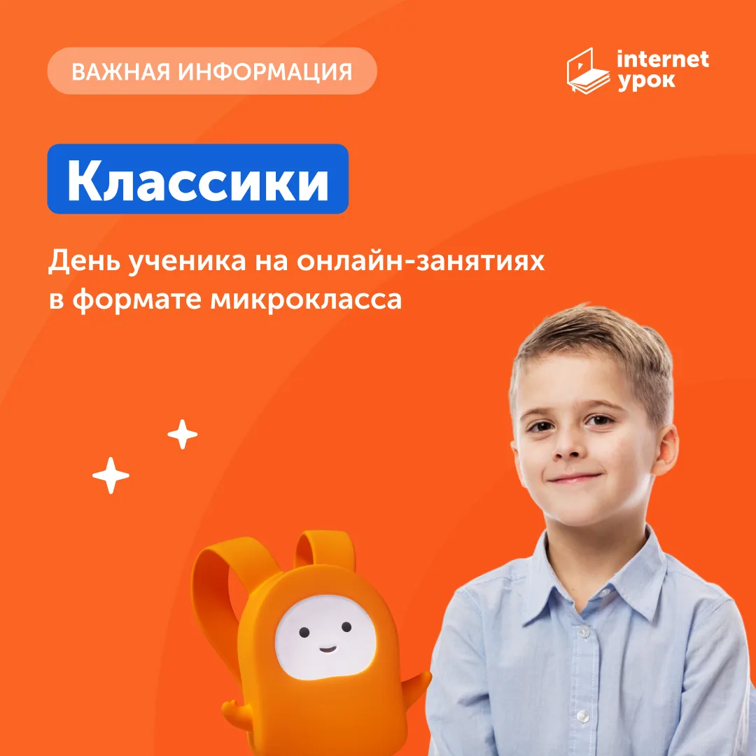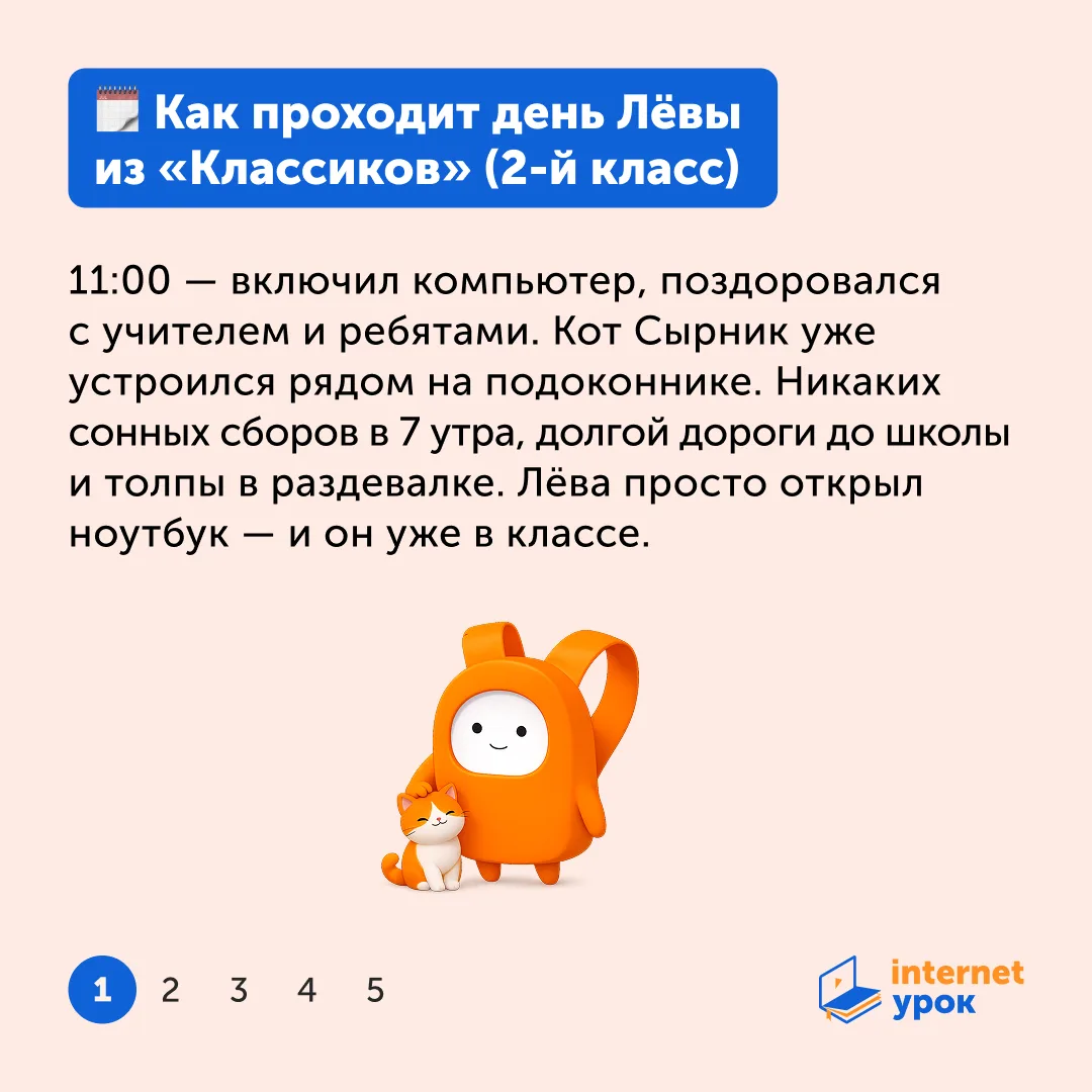 Поэтому в ИнтернетУроке появились «Классики» — как первая ступенька в онлайн-обучении для учеников 1–2-х классов. На карточках рассказываем, как выглядит день ученика «Классиков».