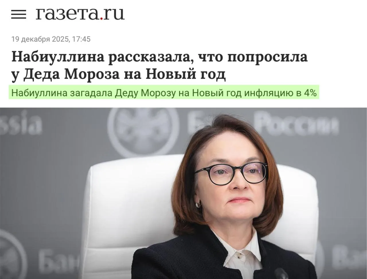 Глава ЦБ, Набиуллина, попросила у Деда Мороза инфляцию 4%.