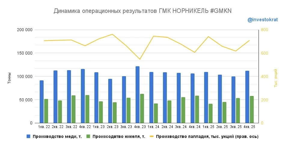 📈 Основной рост цен пришелся уже на 1 квартал 26 года. Если получится удержаться около этих уровней еще несколько месяцев, результат за 26 год сможет порадовать даже без девальвации. Однако, сама компания не уверена в стабильности трендов. Да, среднесрочный потенциал еще есть, но, по никелю висит большая неопределенность, связанная с объемами добычи в Индонезии, способная качнуть баланс как в сторону дефицита, так и еще большего профицита.