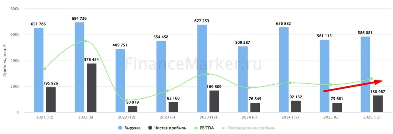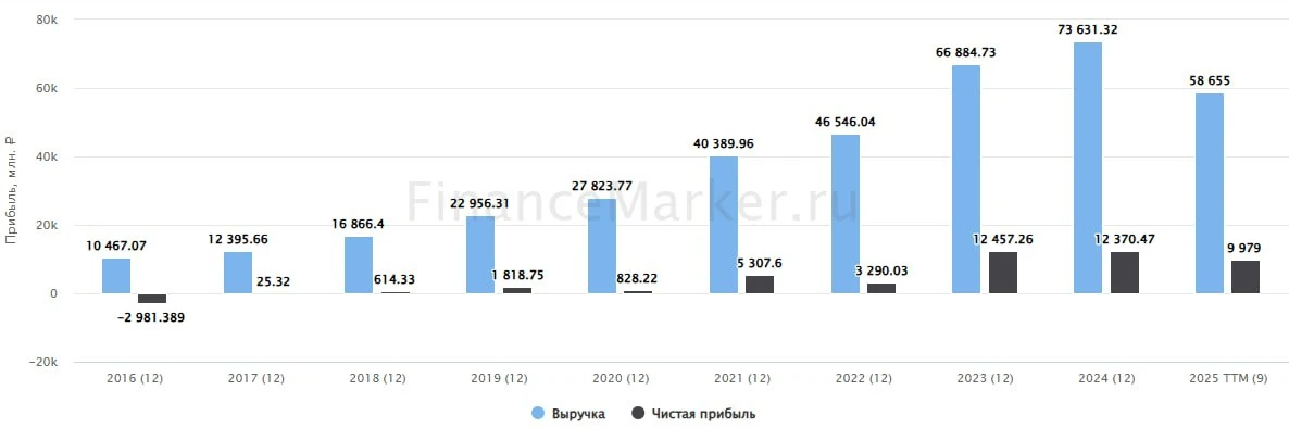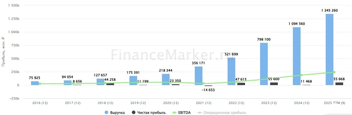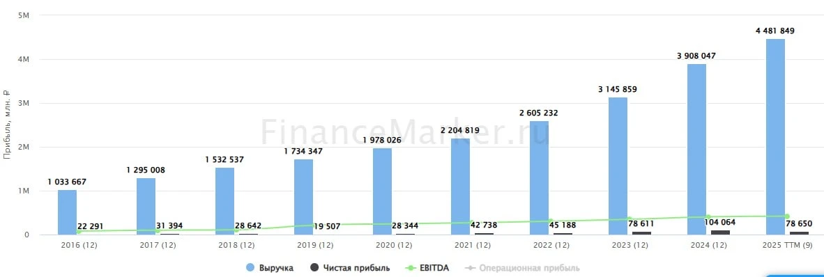 По Яндексу видят более 50% роста: выручка растет темпами выше 30% г/г, компания платит регулярно дивидендам с 2024 года (по 160 руб. в год на акцию), а мультипликаторы остаются примерно на 30% ниже сектора. Прогнозная цена — около 6 700 руб., EBITDA в моделях растёт кратно благодаря масштабу бизнеса.
