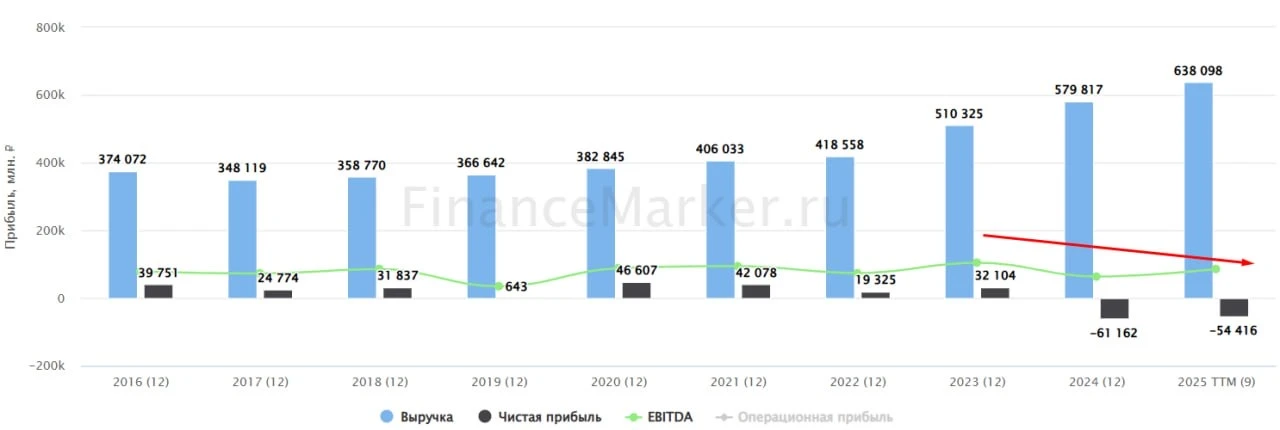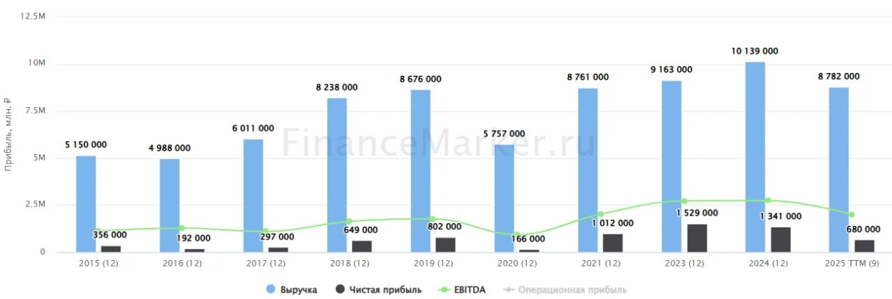 📈 На фоне стагнации физических объемов производства и роста цен, валютная выручка в 25 году прибавила 10% г/г, а EBITDA 9%. Рублевый результат, естественно, хуже из-за крепкого рубля.