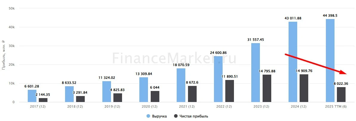 Апсайд более 90%: акция торгуется около уровней 2021 года, тогда как GMV бизнеса вырос в 14 раз. Финтех-сегмент показывает взрывной рост прибыли (+149% г/г), компания начала дивиденды и байбэк. Оценка EV/EBITDA около 5,6x, что выглядит привлекательно.