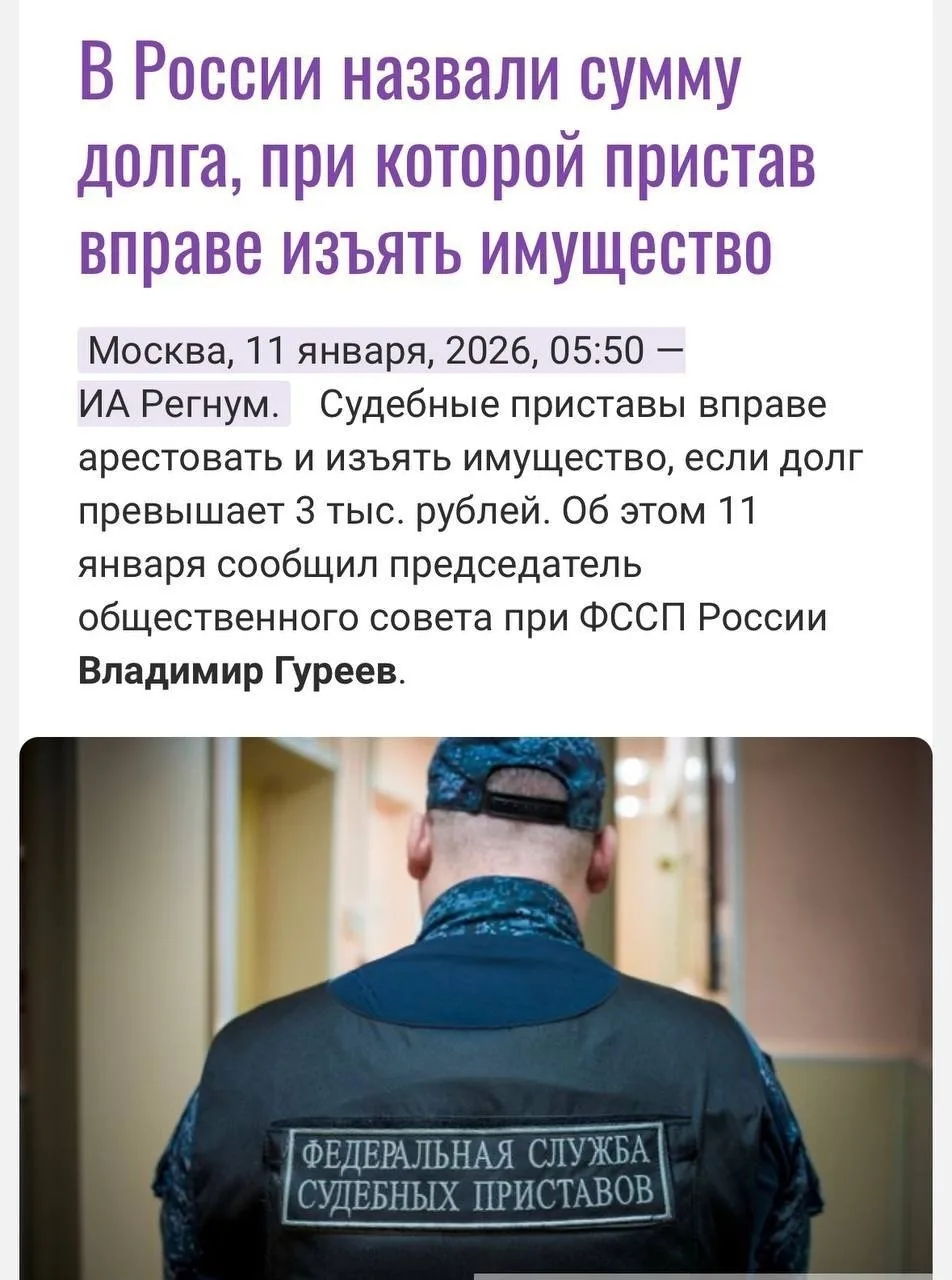 Судебные приставы могут изъять имущество гражданина при задолженности свыше трёх тысяч рублей. Как сообщил РИА Новости председатель общественного совета при ФССП России Владимир Гуреев, законодательство допускает арест имущества при такой сумме долга.