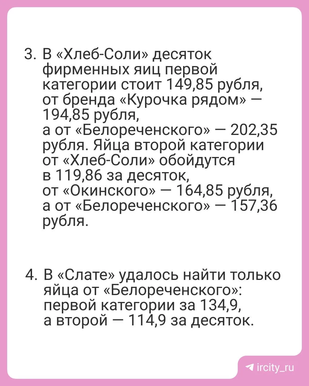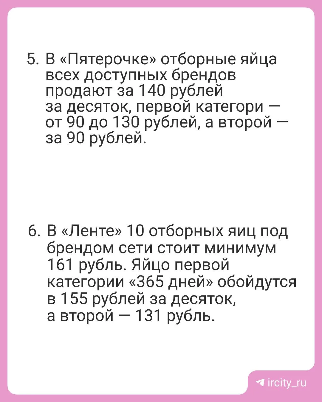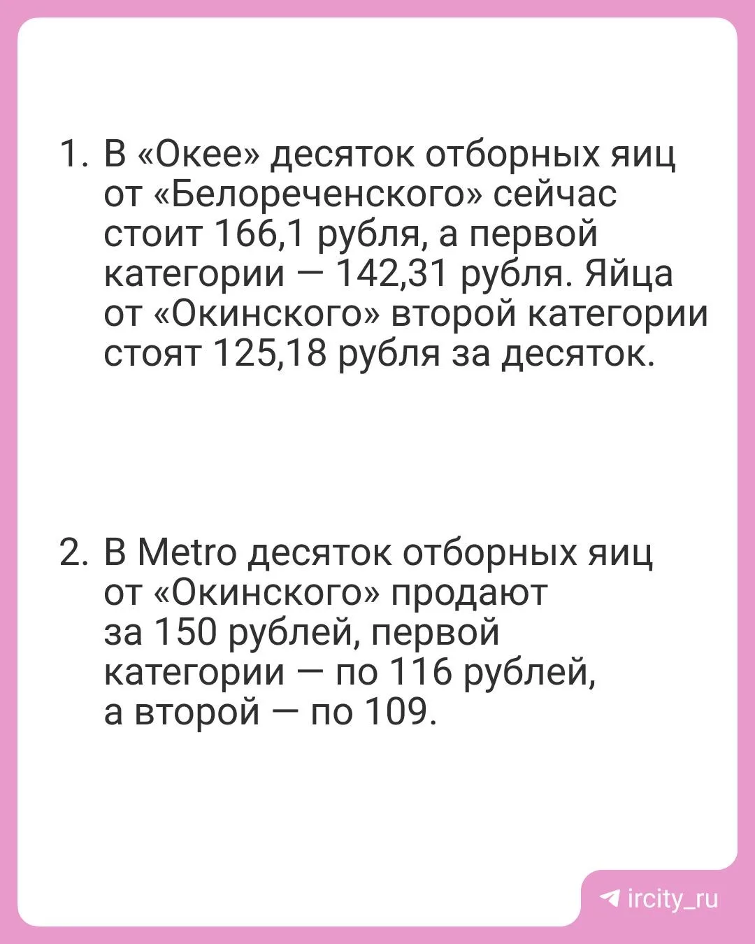 По данным «Иркутскстата» средняя цена десятка в области выросла с января по февраль с 98,52 рубля до 105,41 рубля. По данным на 16 марта, десяток яиц стоил 115,06.
