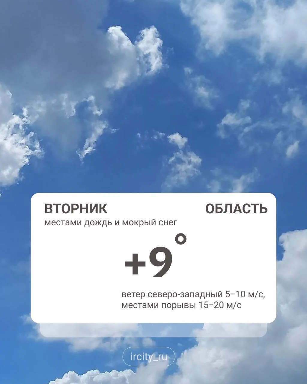 ⏺9 апреля, в четверг, ожидается ветер от 20 метров в секунду и сильнее, в том числе и в Иркутске. В городе может пойти дождь, а по области снег.