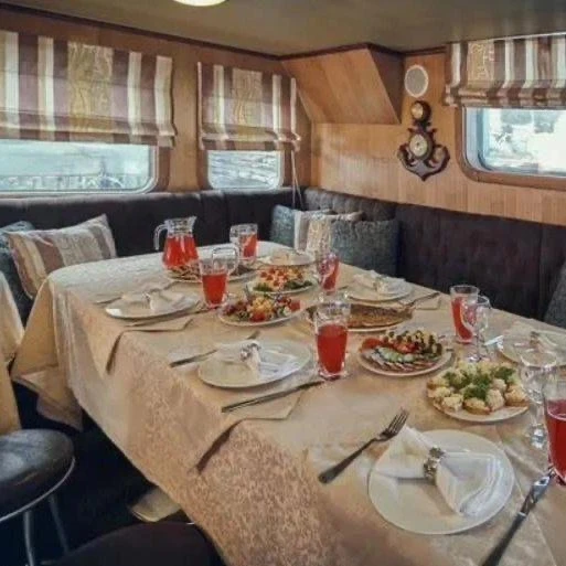 Пассажиры могут расположиться в шести каютах, во всех есть вентиляция, отопление, мягкая мебель, туалеты, душ и телефон внутренней связи. Есть кают-компания на 20 человек с панорамными окнами, двумя большими обеденными столами, камбуз со встроенной мебелью, электроплитой, духовым шкафом.