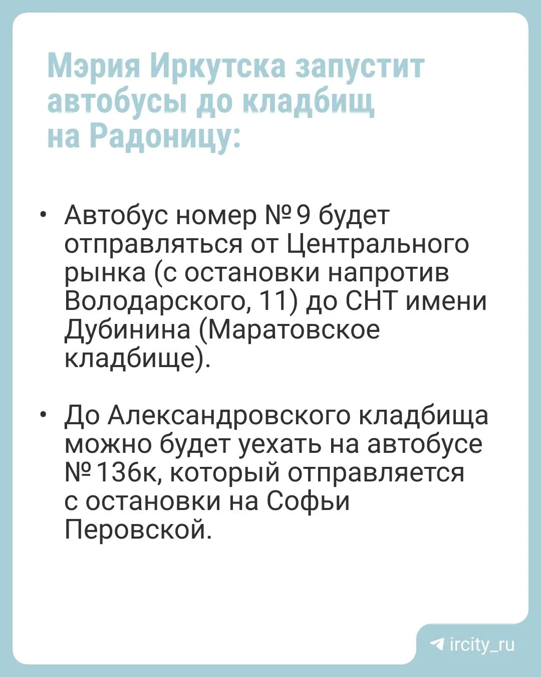В пресс-службе мэрии Иркутского округа, где находятся Марковское и Смоленское кладбища, сказали, что пока не знают, будут ли запускать специальные автобусы.