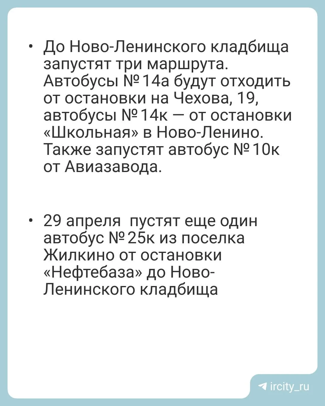 21 апреля наступит Радоница — день, когда принято поминать своих умерших родственников. Мэрия Иркутска 20 и 21 апреля запустит специальные городские автобусы до кладбищ.