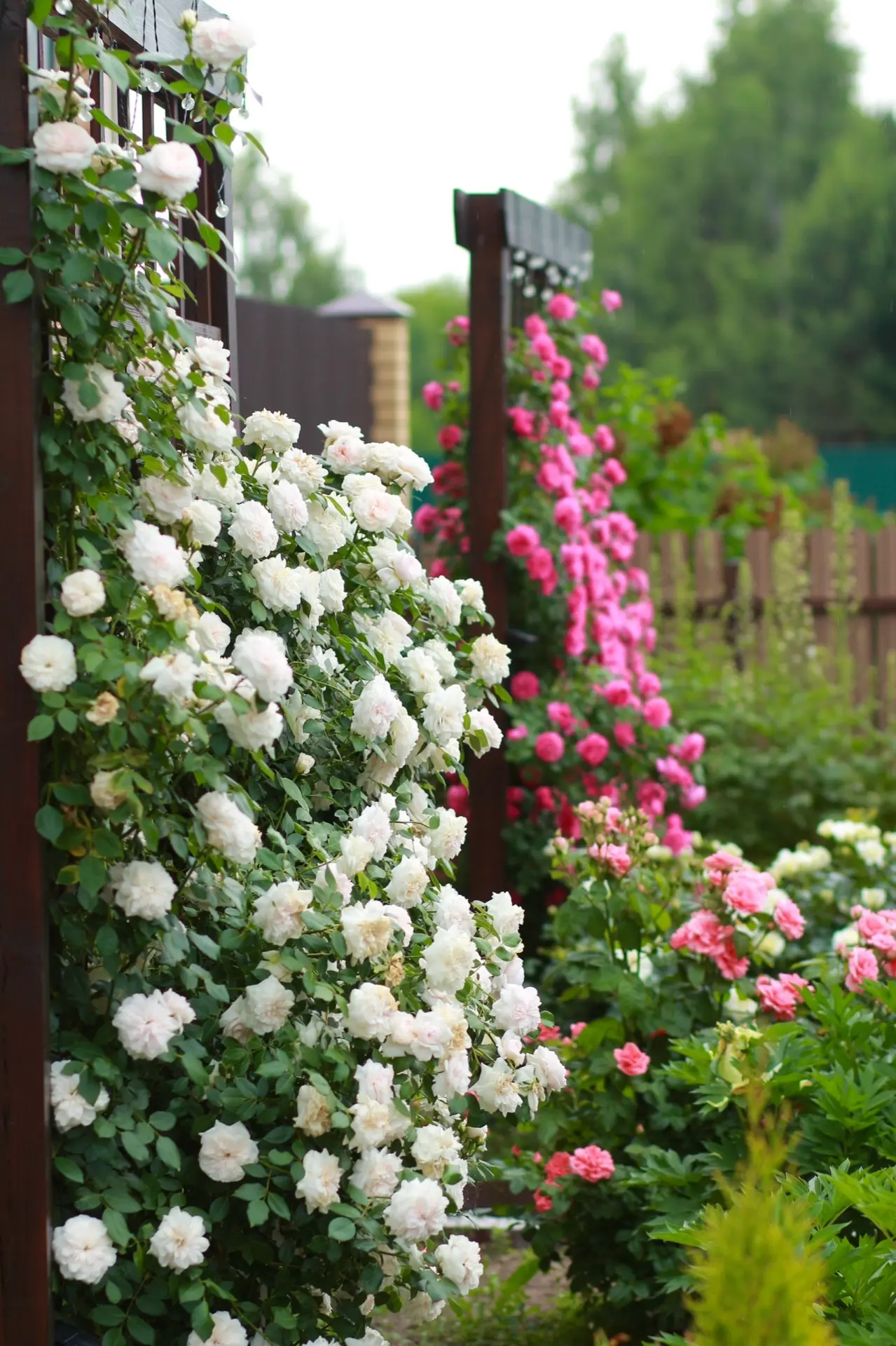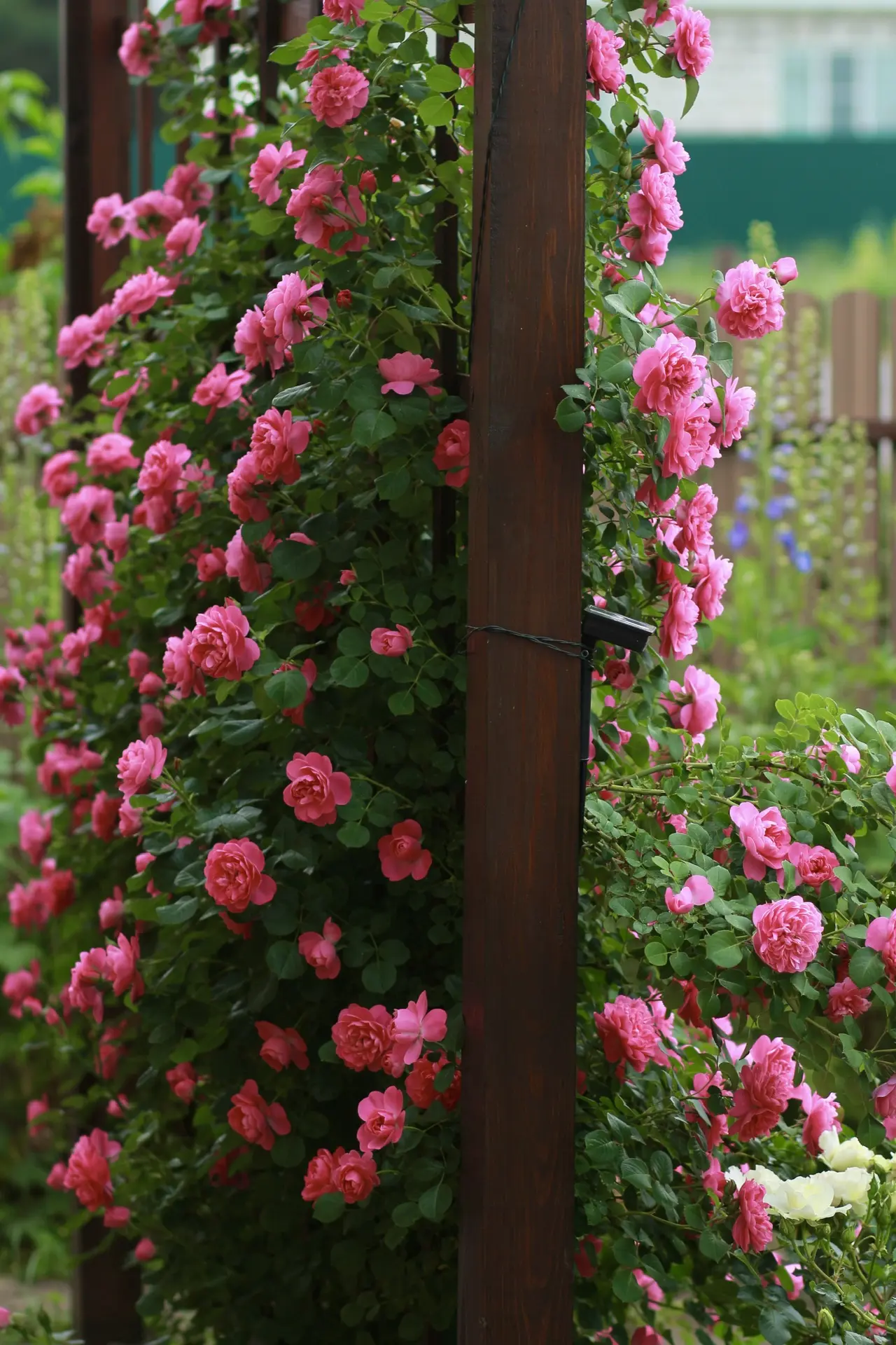 Напомню, эти две большие опоры были установлены в 24 году, и посмотрите, как разрослись на них розы. Они стали огромные, но укрывать их очень удобно, и сами опоры служат отличной стеной.