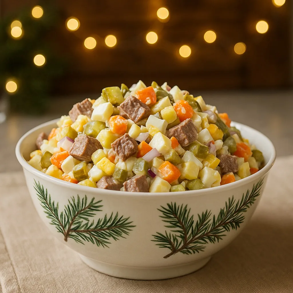1. Подготовка: Отварите говядину до готовности, остудите и нарежьте аккуратными кубиками. Сварите картофель, морковь и яйцо, дайте остыть, очистите и также нарежьте кубиками. Маринованные огурцы нарежьте кубиками, а лук очень мелко измельчите.