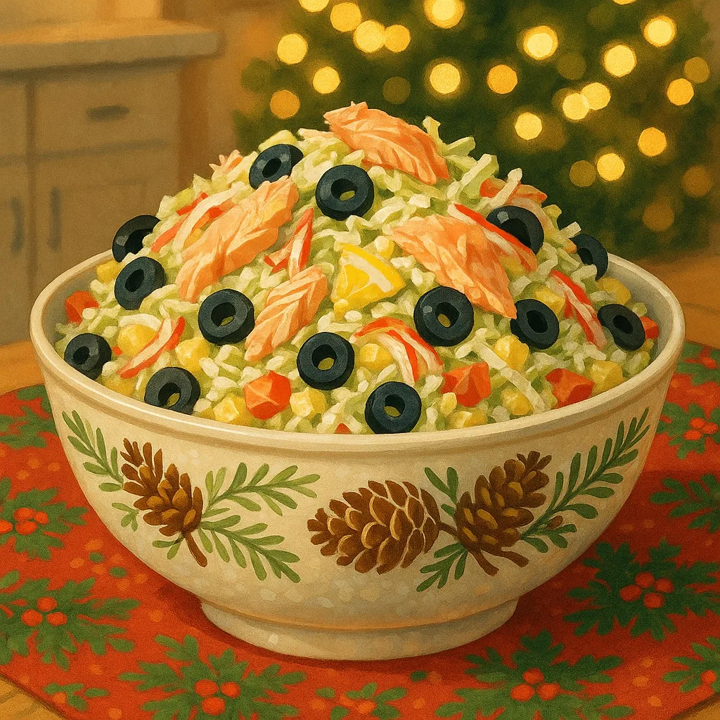 4. Соединяем: В большой и красивой салатнице соединяем все подготовленные ингредиенты: красную рыбу, крабовое мясо (если используете), маслины, свежий салат, помидоры, картофель (если используете) и лимон.