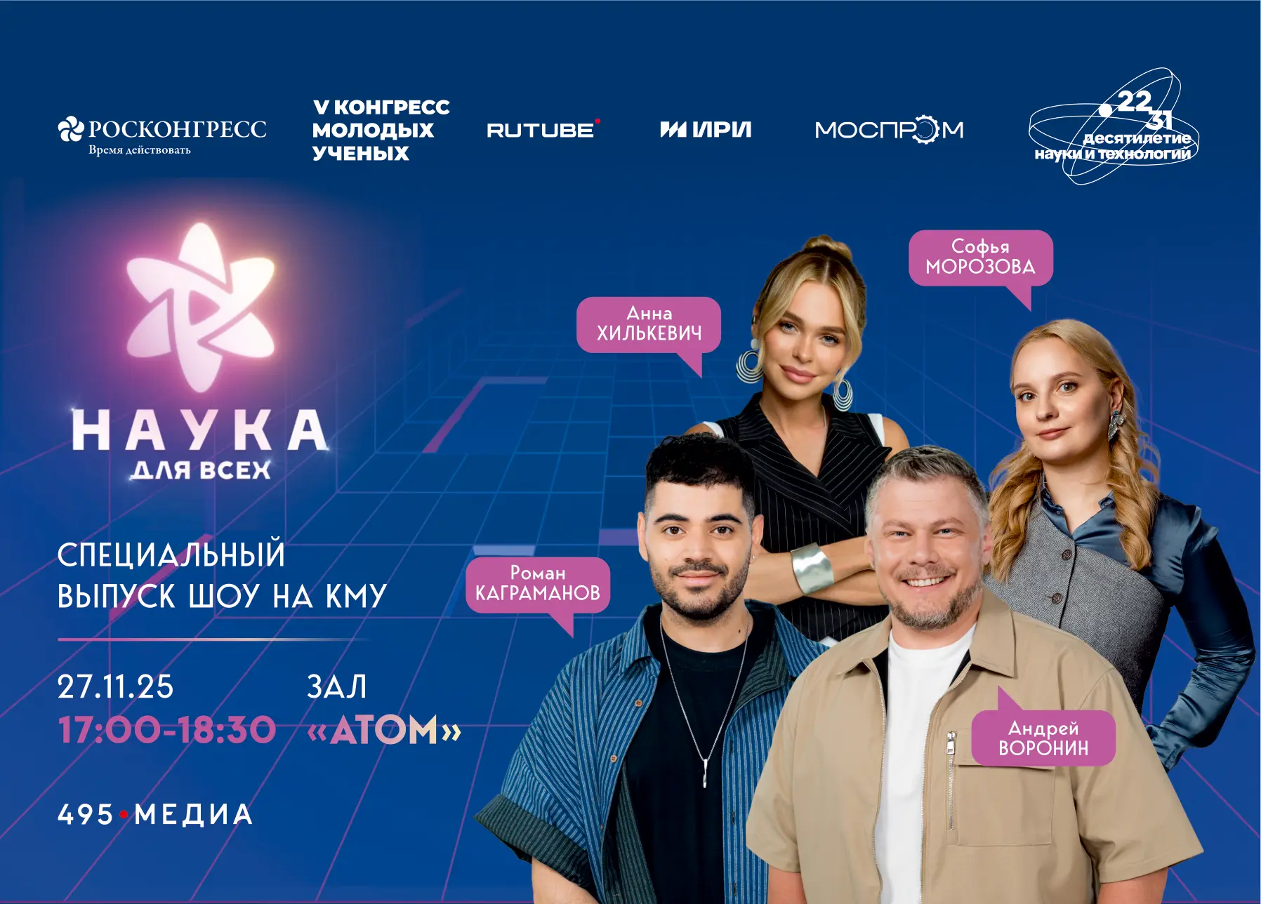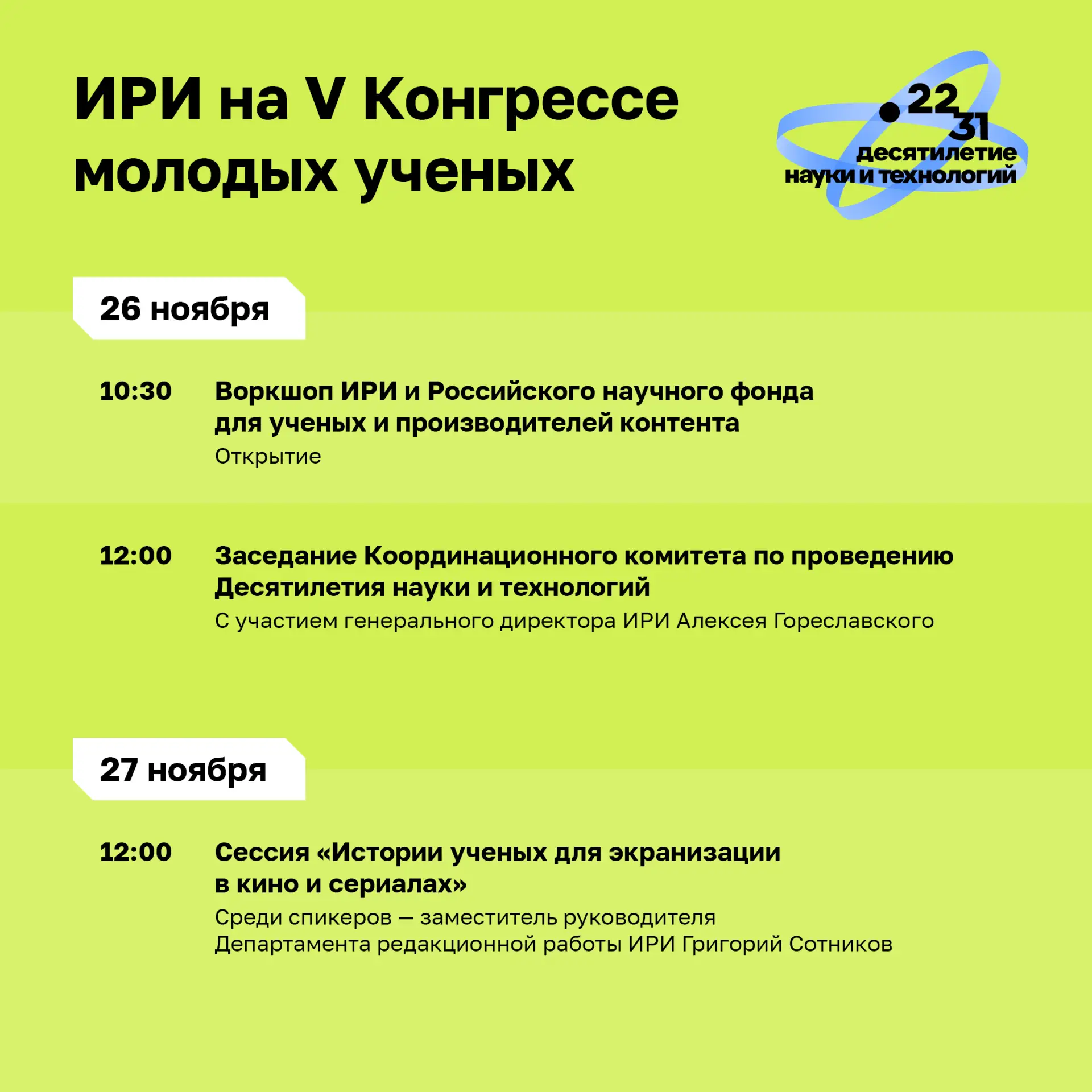 «За три года ИРИ в рамках Десятилетия науки и технологий поддержал более 140 проектов о науке, которые собрали почти миллиард просмотров. Cреди главных тем на ближайшие годы — формирование позитивного образа будущего в проектах разных жанров, от научно-фантастических сериалов до анимации. Поэтому впервые вместе с коллегами из Российского научного фонда мы проводим на полях КМУ специальную мастерскую для ученых и производителей контента — посмотреть, какие есть интересные идеи и о чем сейчас хотят говорить сами люди из науки, так как на большие классные проекты о технологиях, будущем и месте человека в нем — колоссальный спрос».