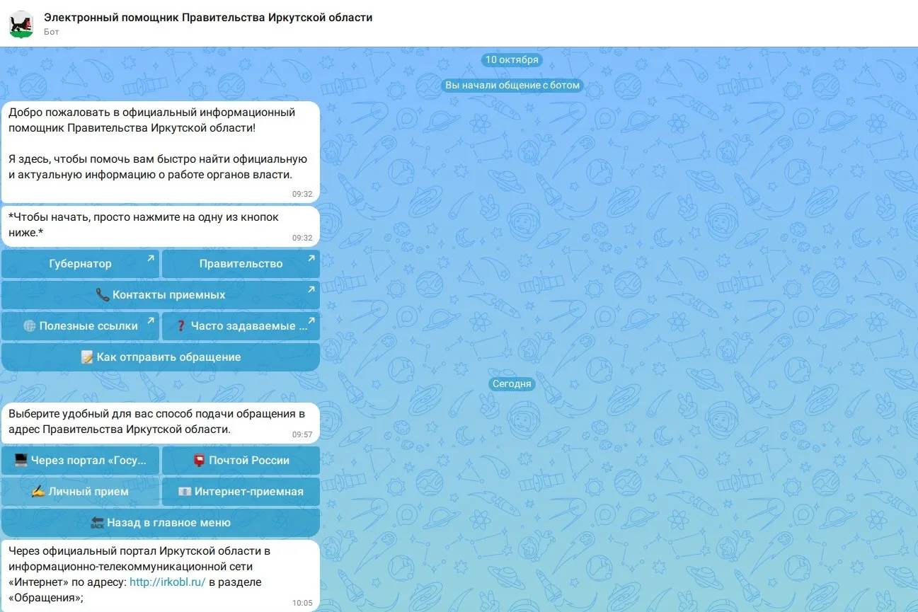 В Иркутской области создан чат-бот, который поможет найти официальную и актуальную информацию о работе органов власти региона. С помощью чат-бота жители Приангарья могут ознакомиться с биографией Губернатора Иркутской области и его полномочиями, быстро найти контакты приемных Правительства региона и полезные ссылки на официальные Интернет-ресурсы госорганов, узнать о разных способах подачи обращений в органы власти, найти ответы на часто задаваемые вопросы.