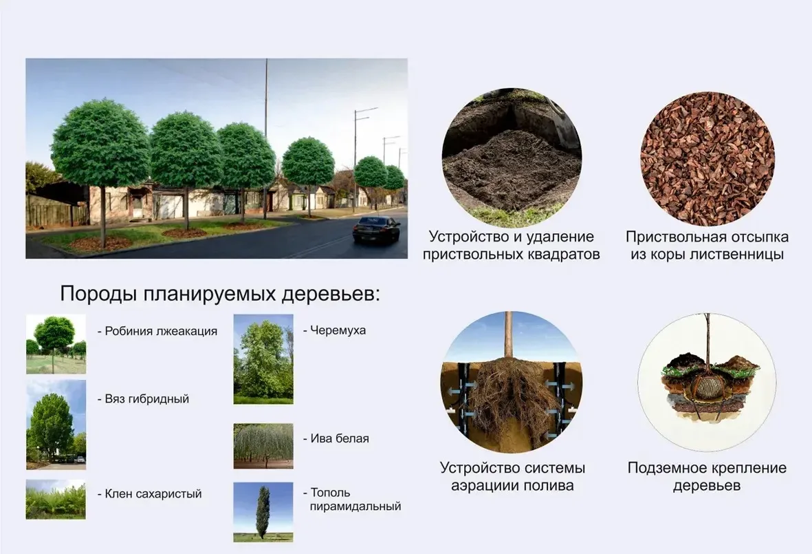 При посадке применяются современные решения: полная замена грунта в посадочной яме с устройством дренажа, подземные трубы для прикорневого полива и аэрации, скрытые анкерные системы крепления, отсыпка приствольного пространства щепой хвойных пород. Всё это обеспечивает и приживаемость, и декоративный вид.