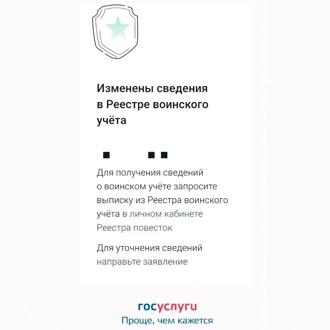 ⚡️ Внимание! На портале Госуслуг начали массово появляться письма от РЕЕСТРА ВОИНСКОГО УЧЁТА. Это уведомления об обновлении данных в реестре воинского учёта, связанные с переходом военкоматов на цифровой формат работы.