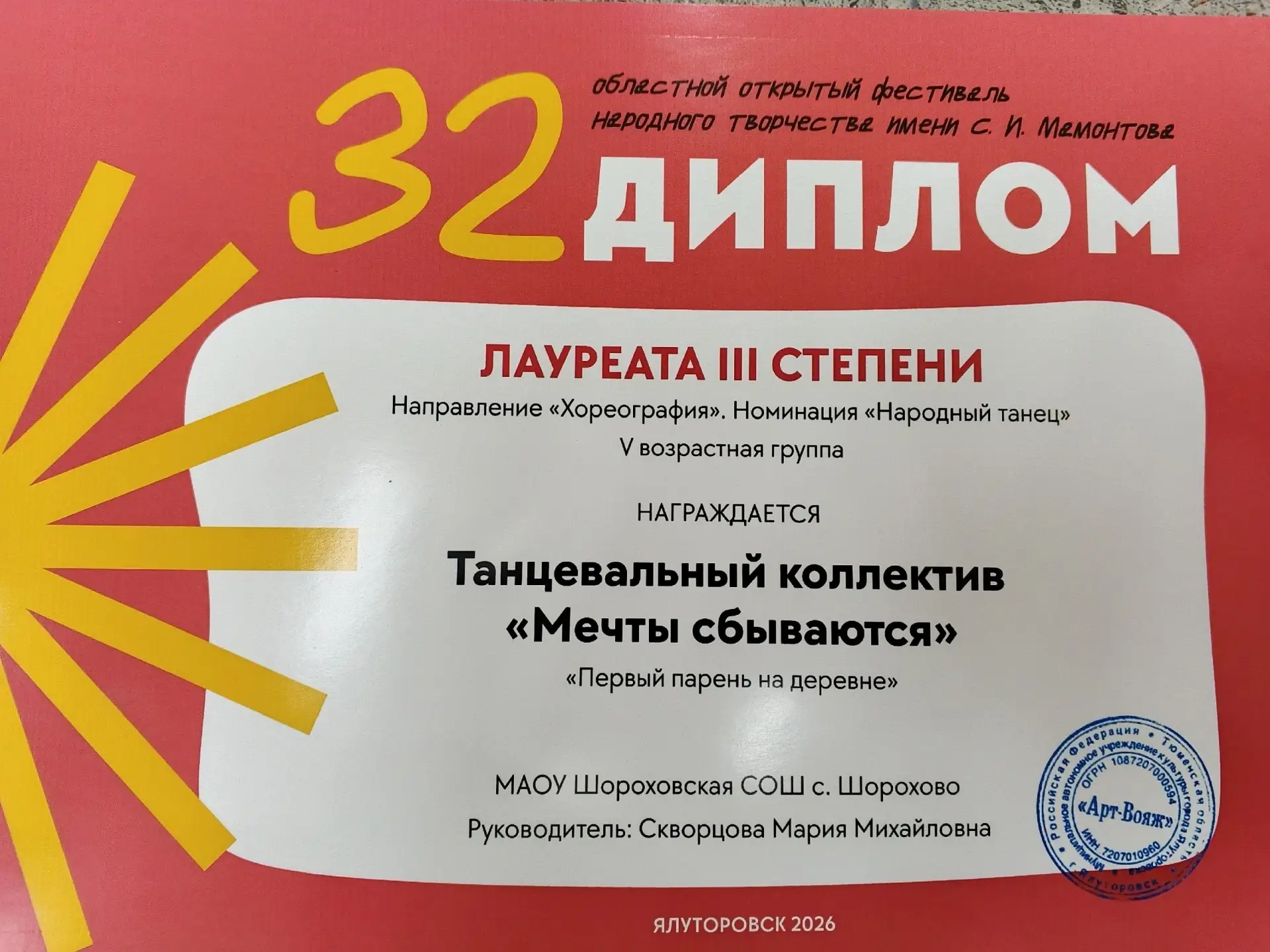 2 апреля 2026 года в городе Ялуторовске состоялся областной открытый фестиваль народного творчества имени Саввы Ивановича Мамонтова. 🎭 В этом году одним из ярких участников стал танцевальный коллектив «Мечты сбываются» (45+) из села Шорохово со стилизованной народной танцевальной композицией «Первый парень на деревне». 💃