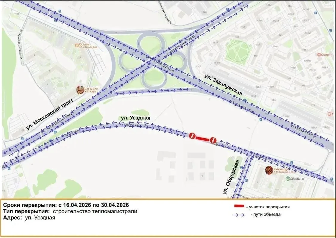 Объехать закрытый участок можно через улицы Обдорскую, Закалужскую и Московский тракт.