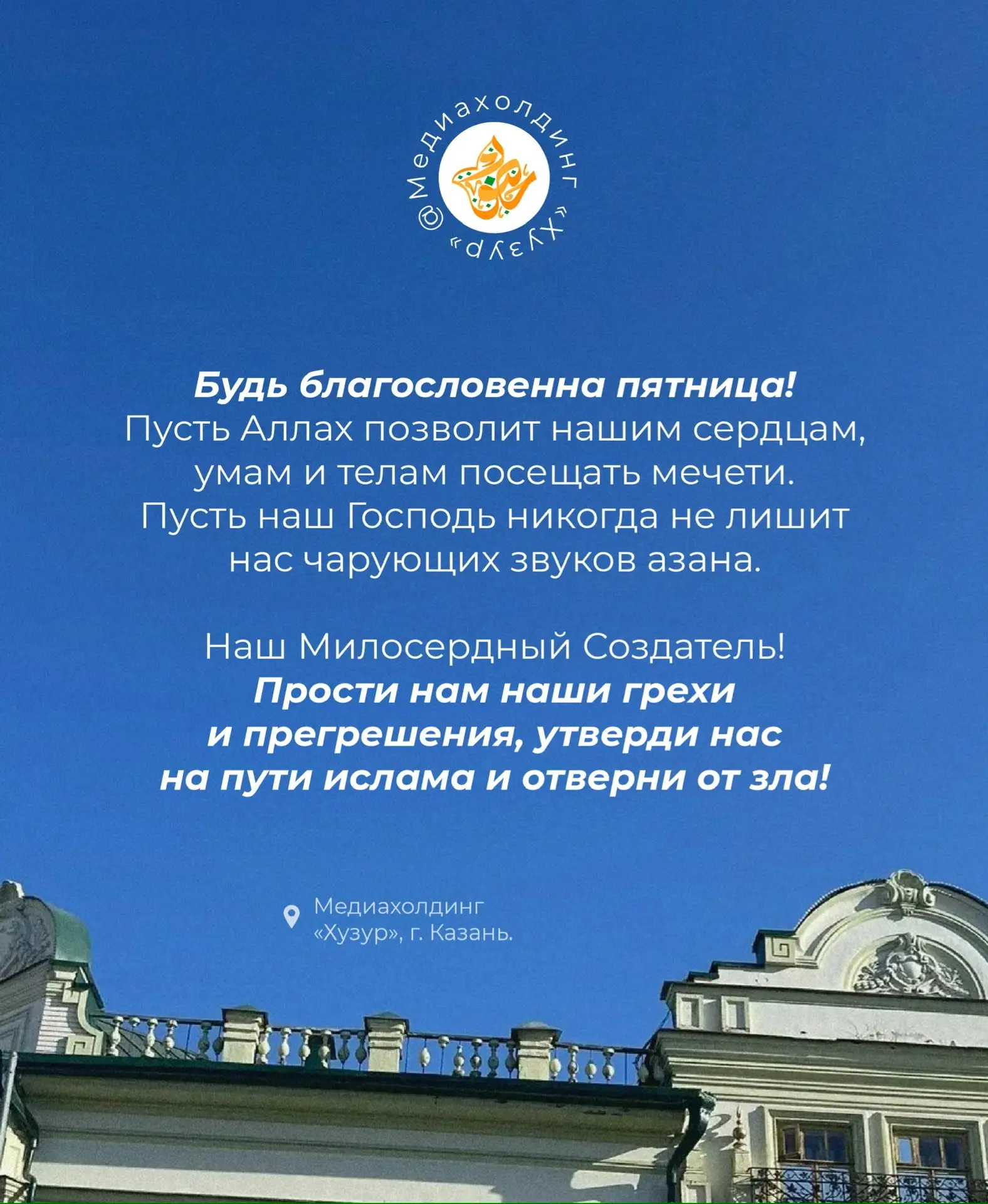 Медиахолдинг «Хузур» желает вам душевного тепла, крепкого имана и принятия молитв в этот благословенный день. Цените каждую минуту пятницы!