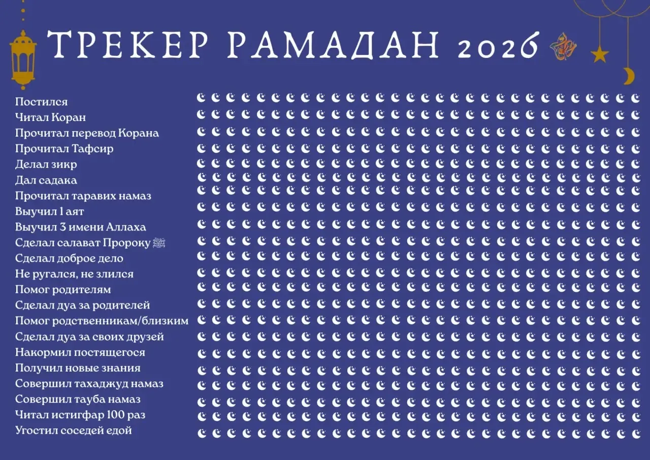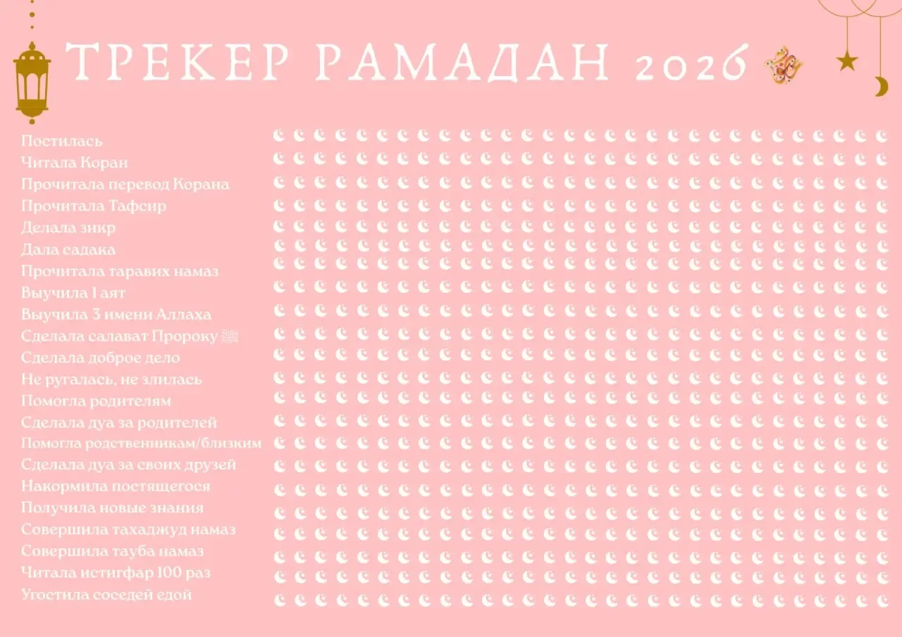📈 Трекер Рамадана: Отслеживайте свои успехи в чтении Кур’ана, совершении молитв, выплате садака и других благих делах. Наглядный способ увидеть свой прогресс и оставаться мотивированным на протяжении всего месяца. Есть несколько вариантов трекера.