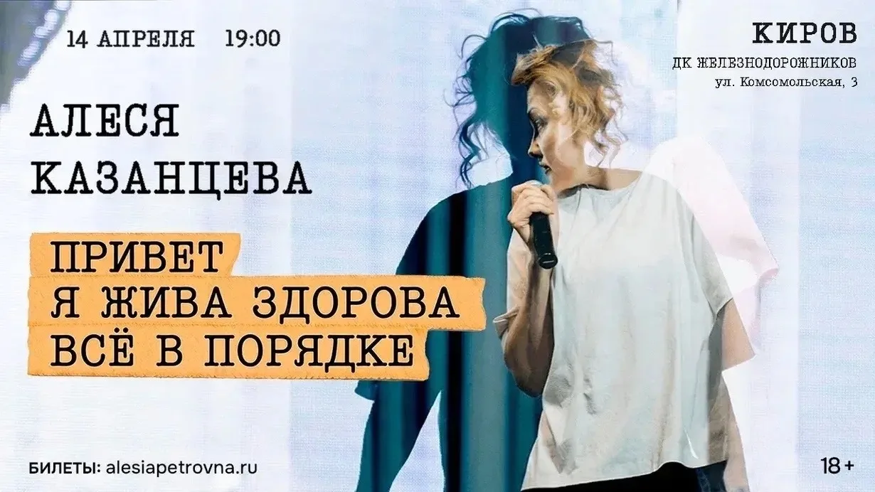 14 апреля с сольным концертом выступит Алеся Казанцева – кинорежиссер, блогер, писатель и стендап-артистка.