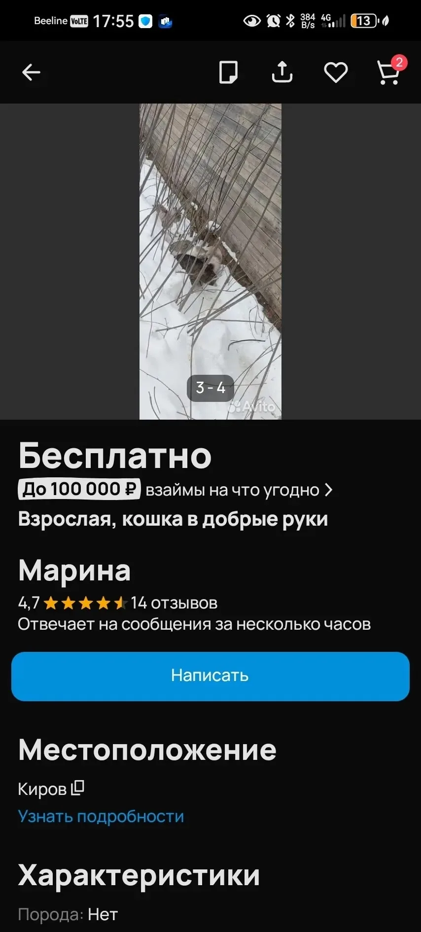 – Я живу в частном доме в Вересниках, – рассказал Андрей «Источнику Онлайн». – У нас есть кот – любимец семьи, выпускаем его на самовыгул. 30 января кот домой не вернулся. Мы долго его искали, развесили объявления. 4 февраля я увидел фотографии своего кота на «Авито». Объявление «Отдадим в добрые руки кота по кличке Митяй» выложила некая Марина. На мой звонок она ответила, что потратила на кота много денег и их нужно компенсировать. Я сказал, что напишу заявление в полицию, общение со мной прекратилось.