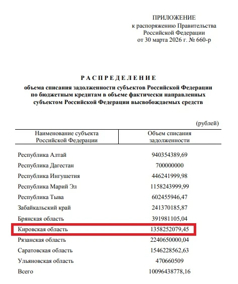 Правительство РФ списало Кировской области более 1,3 млрд рублей задолженности по бюджетным кредитам. Соответствующее распоряжение подписал премьер-министр Михаил Мишустин.