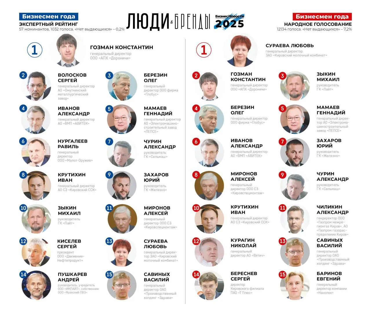 Константин Гозман победил в номинации «крупный бизнес» по мнению экспертов рейтинга «Люди и Бренды-2025» издания «Бизнес новости в Кирове», а Любовь Сураева одержала победу в рамках народного голосования.