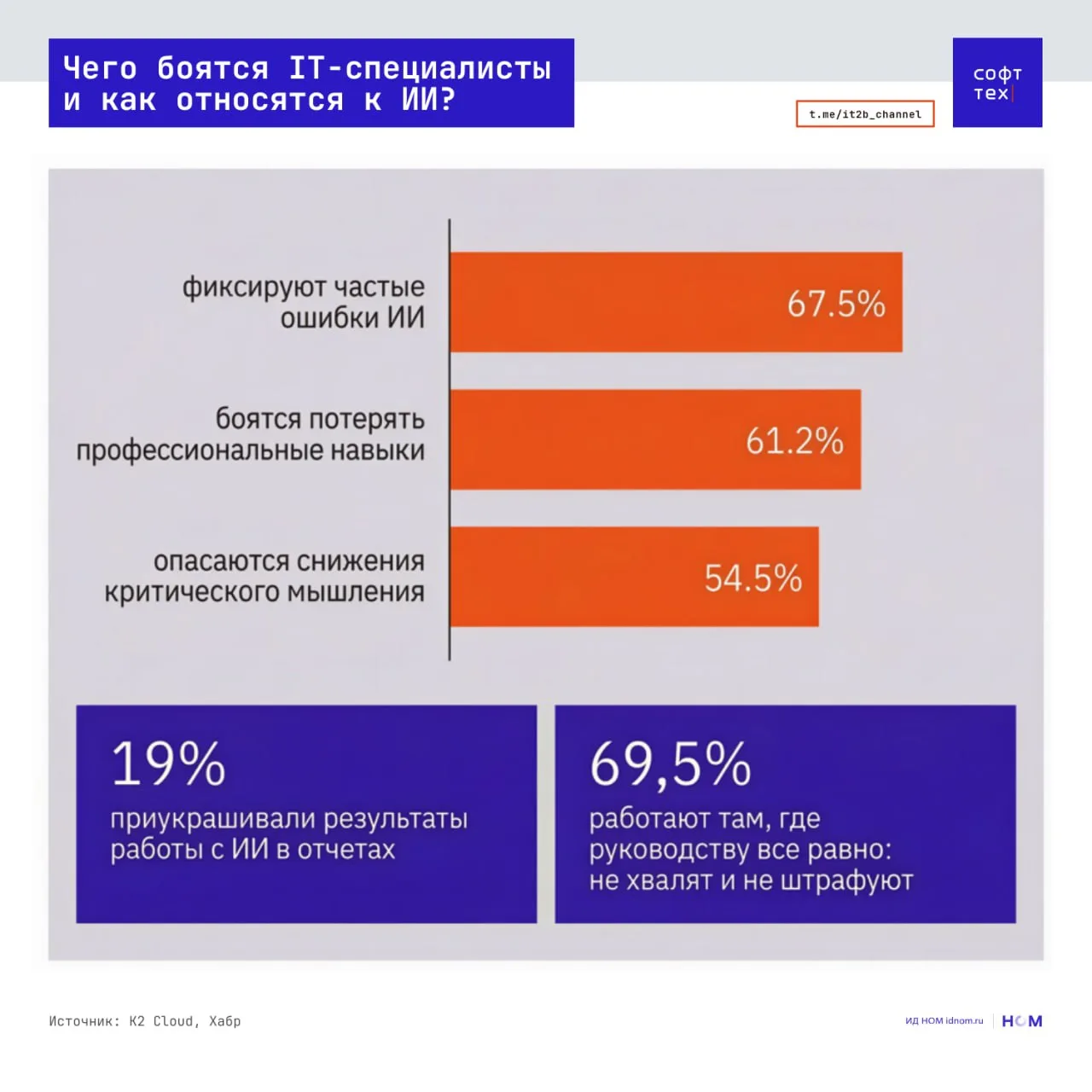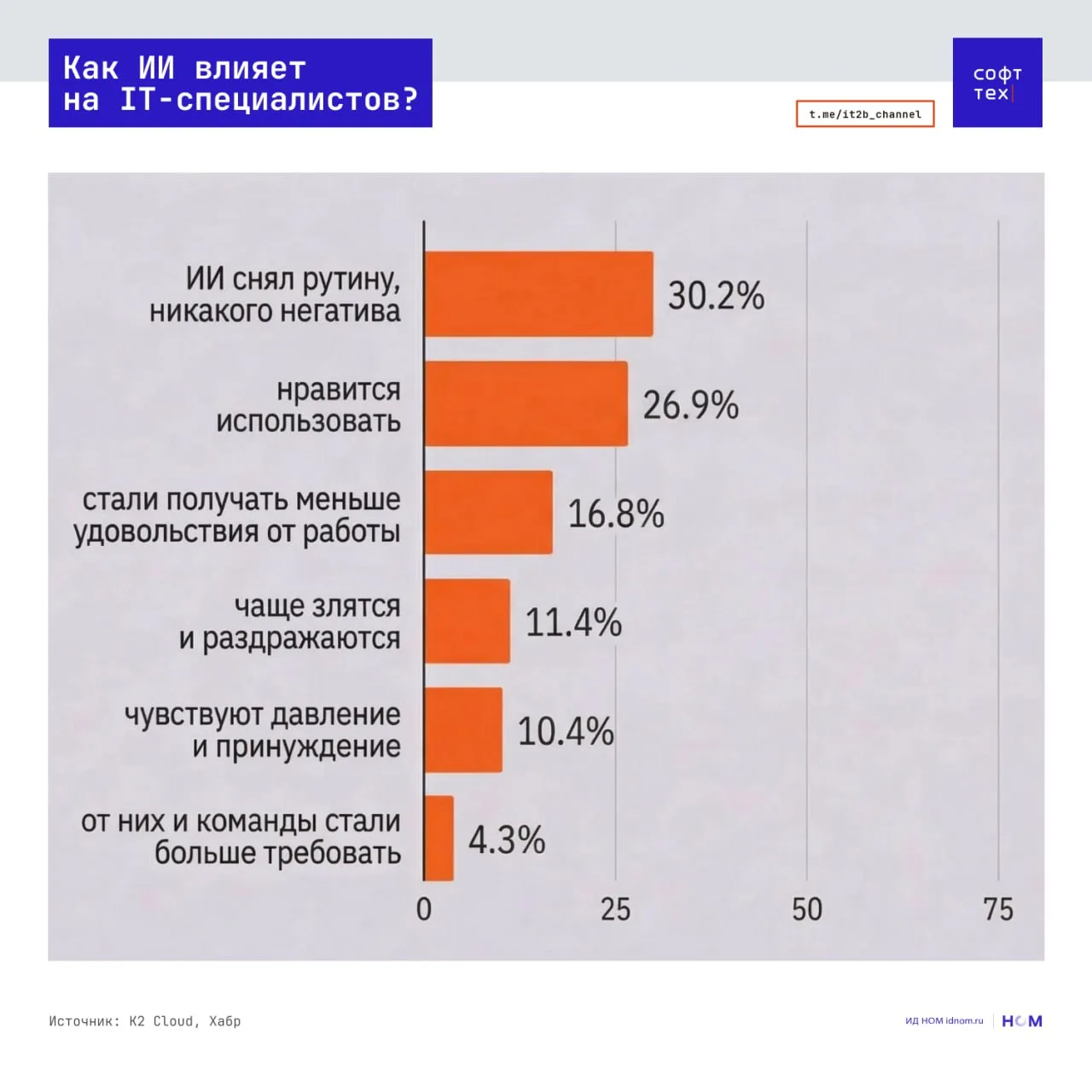 K2 Cloud совместно с Хабр провели опрос айтишников по поводу работы с ИИ. Вот к каким выводам они пришли: