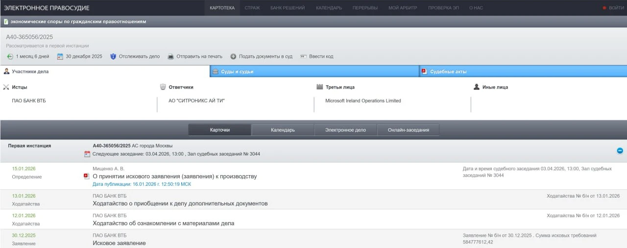 ВТБ подал иск на целых 584 млн руб. к «Ситроникс АЙ ТИ» из-за неисполнения последним своих обязательств по сублицензионному договору за 2022 г. То есть снова история с прекращением техподдержки сервисов ушедшей из России компании.