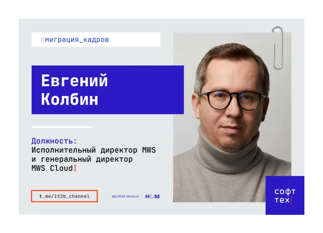 Евгений Колбин, который еще совсем недавно возглавлял Cloud․ru, назначен исполнительным директором IT-холдинга MWS и гендиректором облачного подразделения MWS Cloud. Ранее обе позиции занимал Игорь Зарубинский, который переходит на другую должность в периметре группы МТС