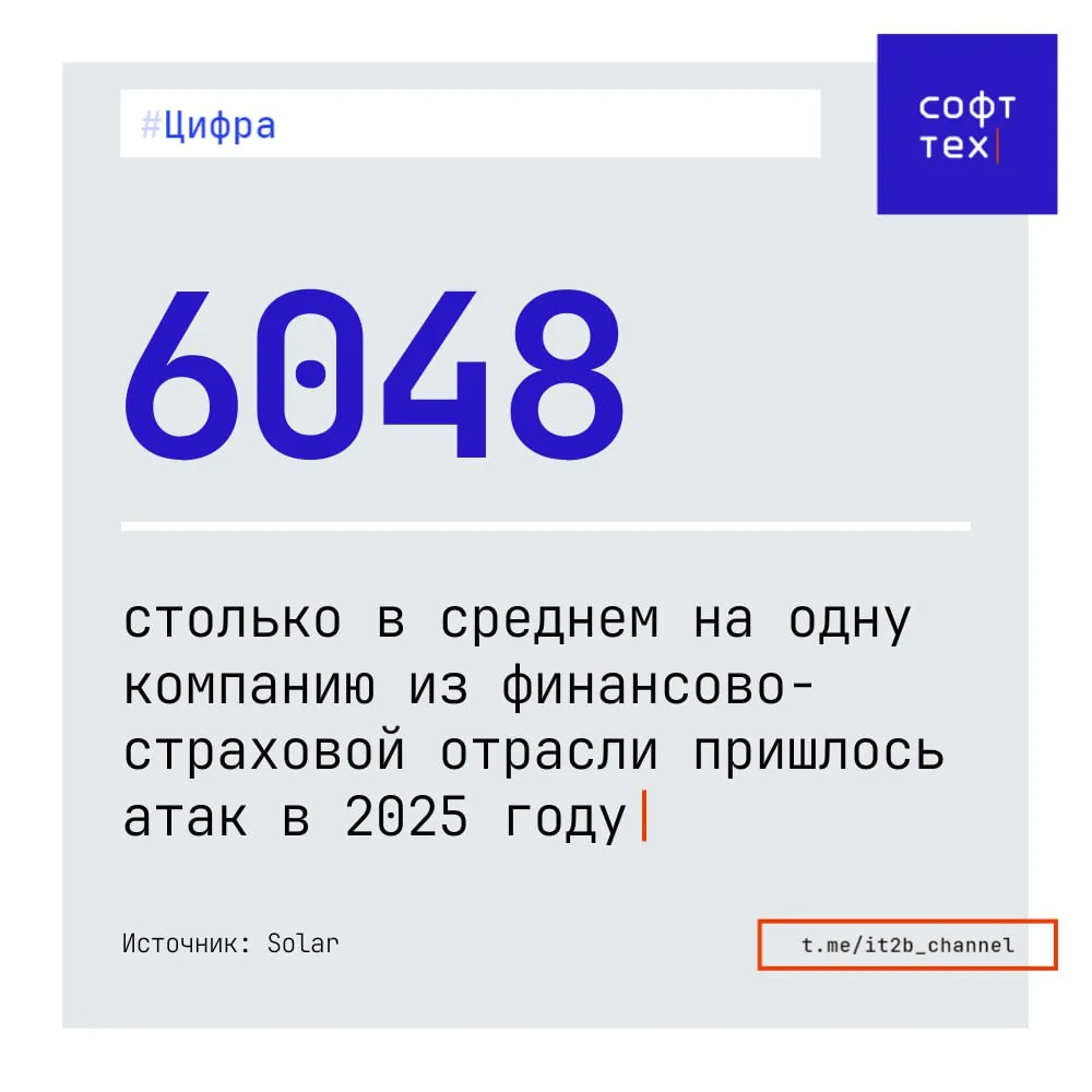 - В среднем на одну компанию из финансово-страховой отрасли в 2025 году пришлось 6048 кибератак;