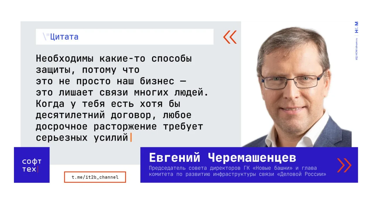 Чтобы исправить ситуацию, Чермашенцев предлагает закрепить в законе «О связи» особый статус инфраструктурных операторов и признать инфраструктуру связи критичной для общества — как энергетику и транспорт.