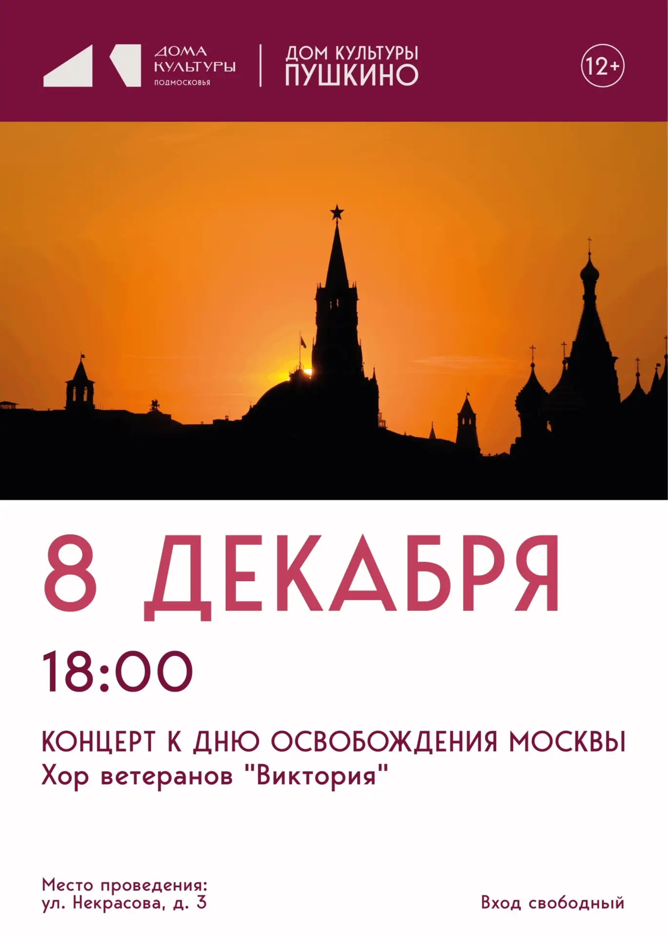 Дом культуры "Пушкино" открывает двери для всех желающих почтить память героев и насладиться прекрасным концертом, посвящённым Дню Освобождения Москвы.