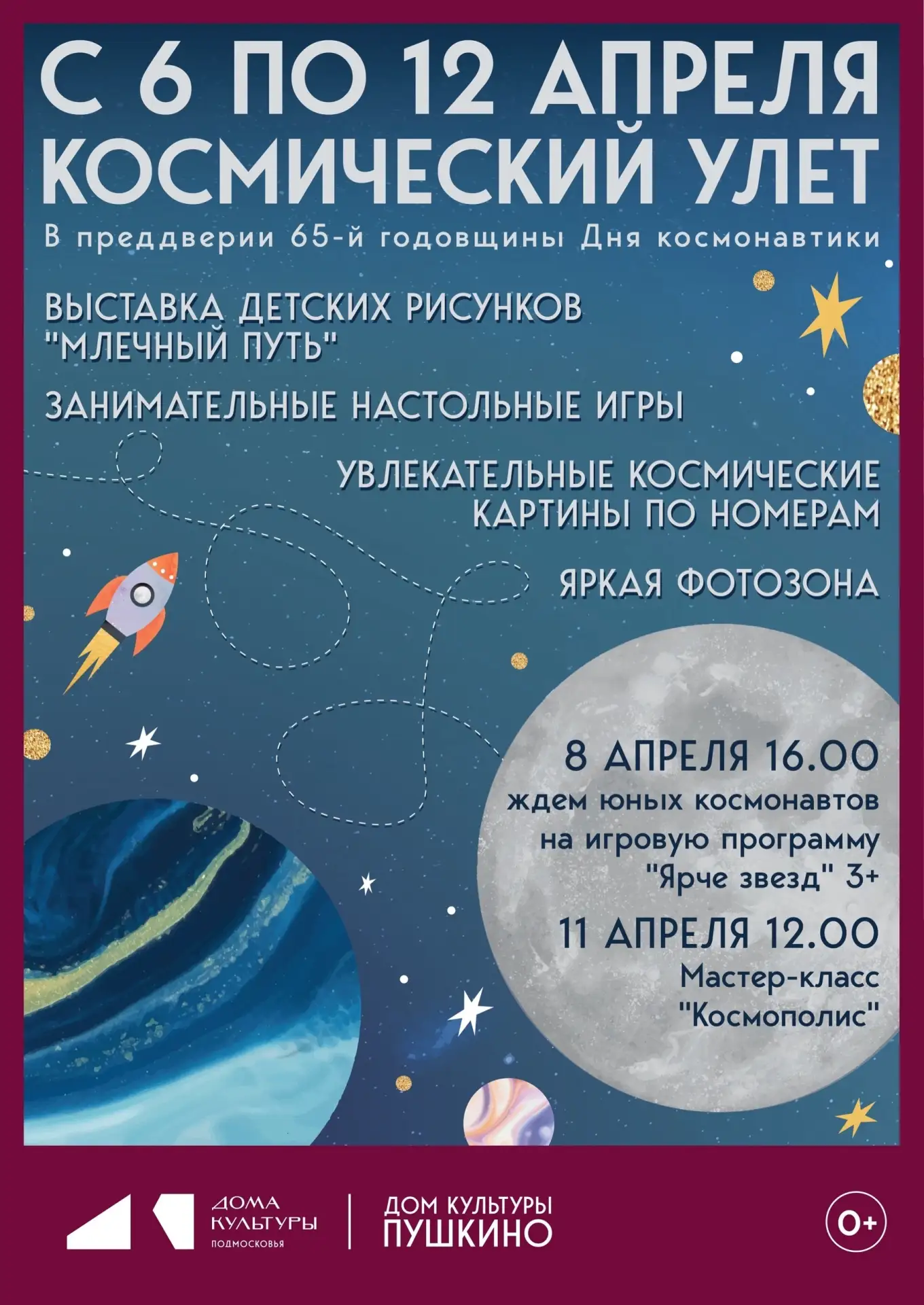 💫 В преддверии 65-й годовщины Дня космонавтики всю неделю с 6 по 12 апреля в фойе 1-го этажа вас ждет "Космический улет" в доме культуры "Пушкино":