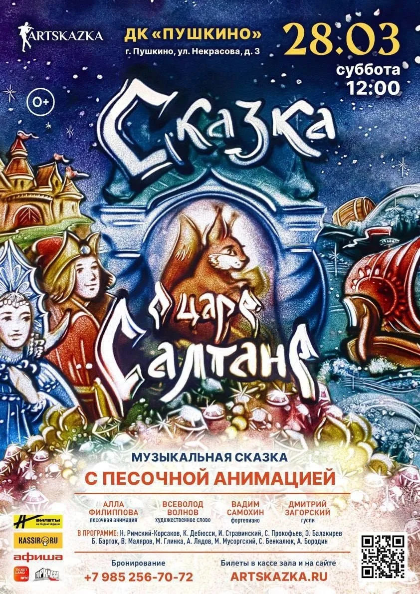 Нас ожидают удивительные чудеса: мифический остров-град Буян, белочка, грызущая золотые орешки, могучие богатыри, прекрасная Царевна - Лебедь и, конечно, классическая музыка! В программе Римский-Корсаков, Глинка, Алябьев, Мусоргский в исполнении пианистки Елены Эндебери, гусляра Дмитрия Загорского и гобоиста Петра Степанова. Сказочный мир оживет прямо на ваших глазах в красочных картинах из песка Лидии Миллер. А проведет нас в мир Пушкина, актер театра и кино, Сергей Степанов!