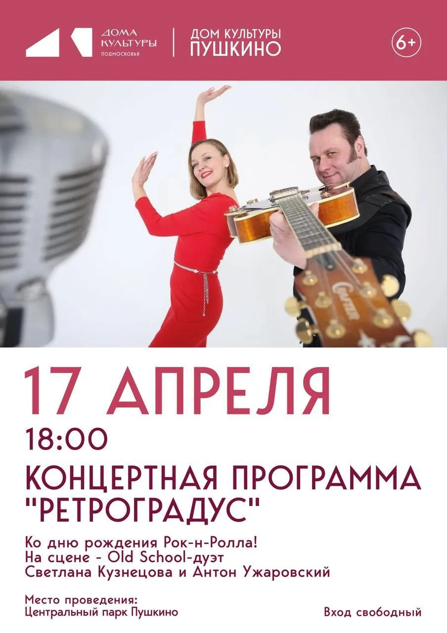 Концертная программа «РЕТРОГРАДУС» посвящена дню рождения рок-н-ролла. На сцене выступит Old School-дуэт. Светлана Кузнецова и Антон Ужаровский.