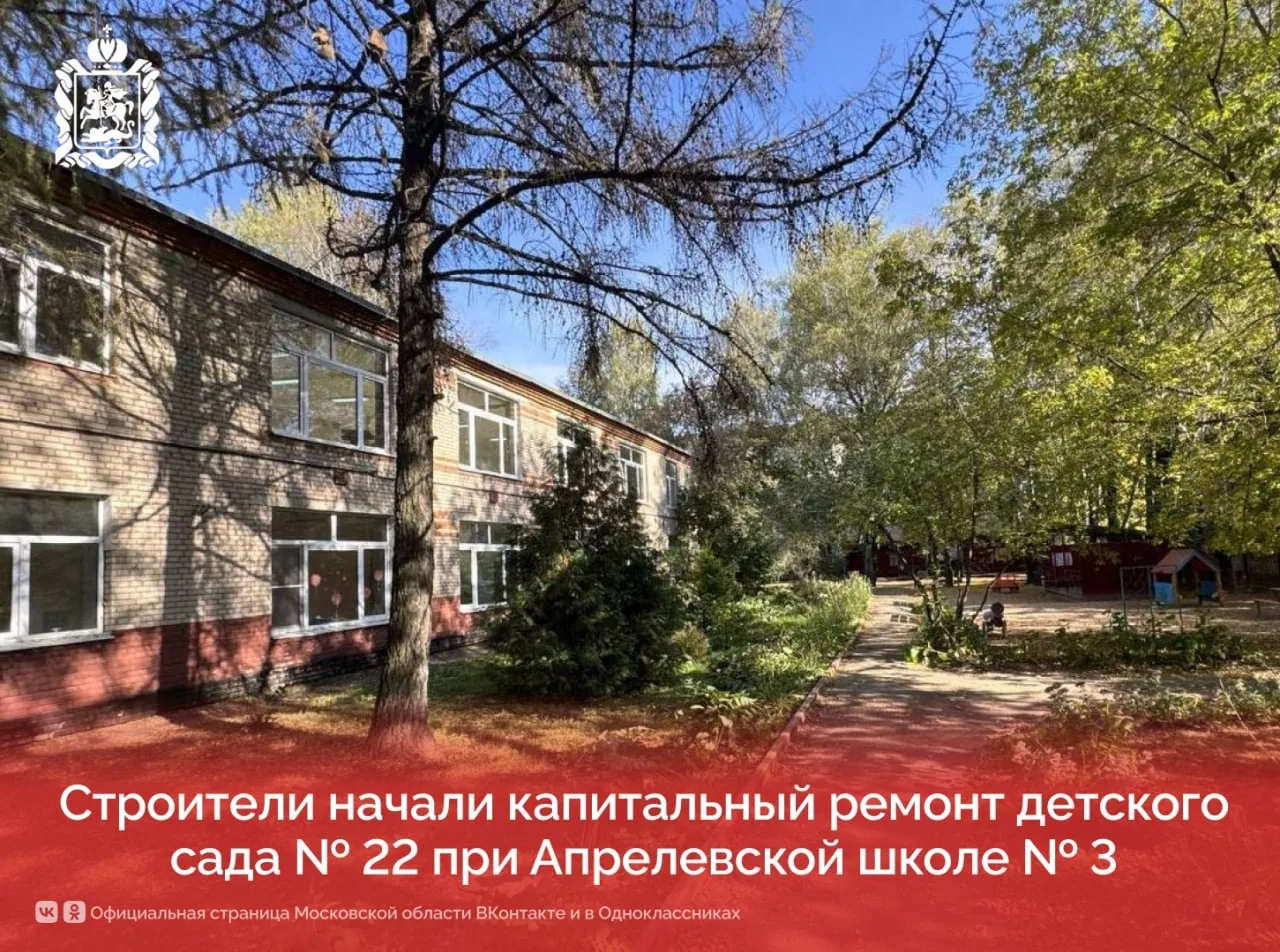 На улице Пойденко, д. 8 в Апрелевке Надо-Фоминского г.о. начались работы по капитальному ремонту дошкольного отделения № 22 Апрелевской средней школы № 3. Подрядчик приступил к демонтажным работам.