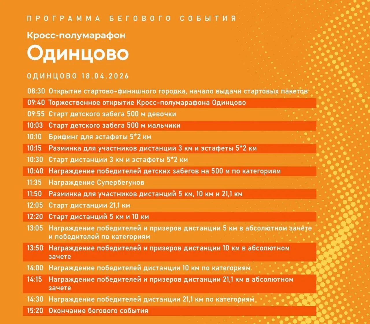 💪 Участников ждут разминки перед стартами, а после — награждение победителей и призеров.