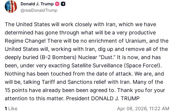 ❗️Ночью Дональд Трамп заявил о готовности к диалогу с Ираном на базе предложений, переданных Тегераном. Он пообещал приостановить удары на две недели при условии, что Иран согласится на полное открытие Ормузского пролива.