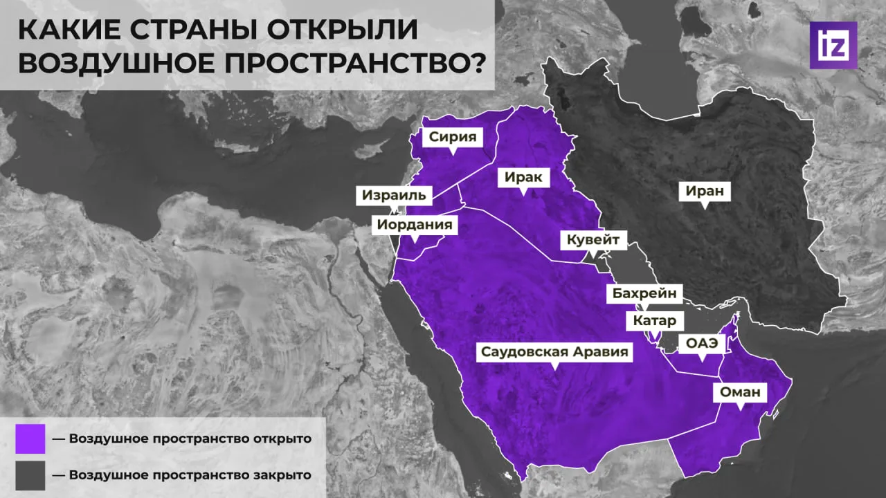 Среди них: Сирия, Иордания, Ирак, Саудовская Аравия, Катар, ОАЭ и Оман. На карте "Известий" видно, что воздушное пространство остается закрытым над территориями Израиля, Ирана, Кувейта и Бахрейна.